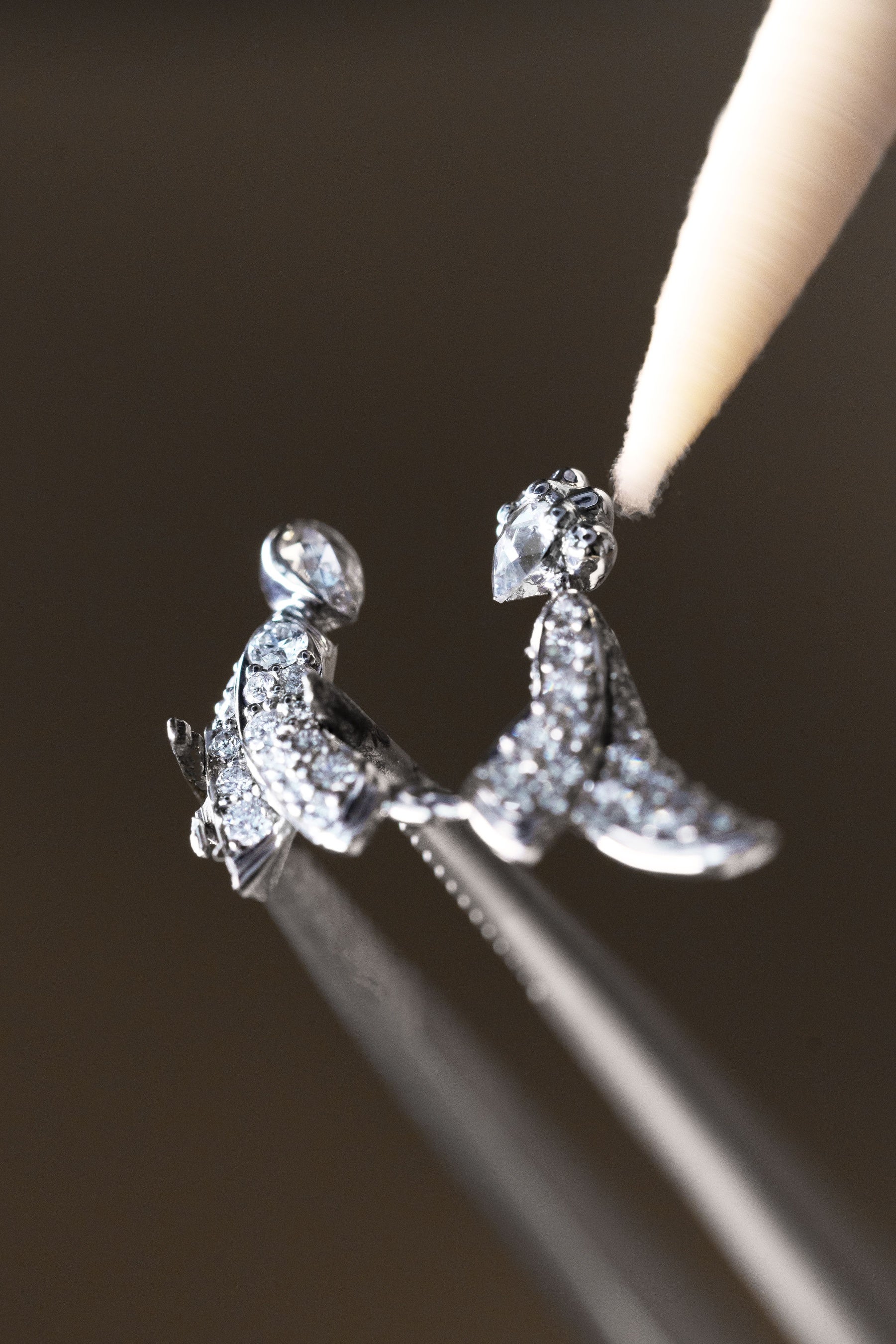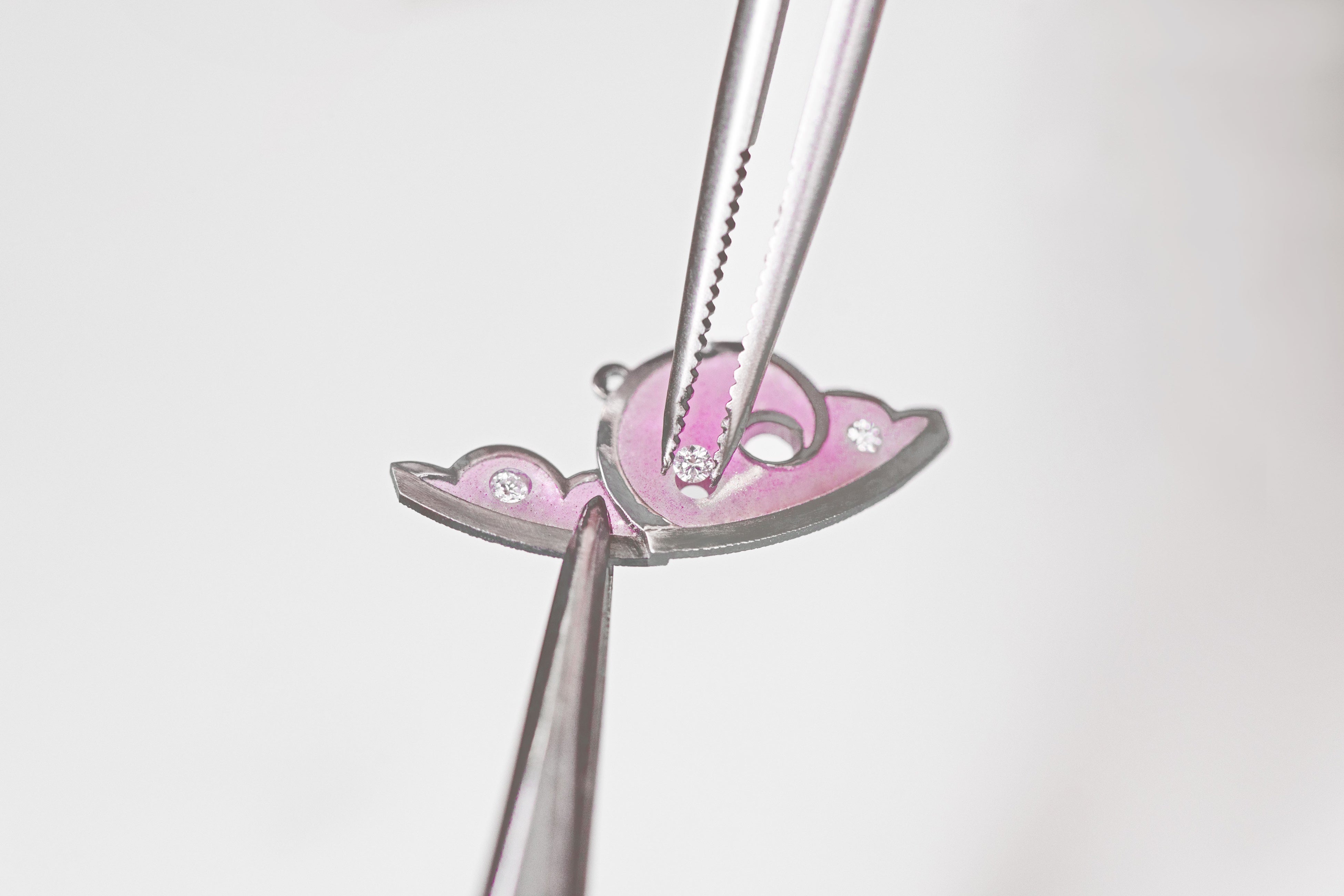ヴァン クリーフ&アーペルは、こうした伝統技法に加え、装飾の立体感を強調する革新的なエナメル技法を採用しています。クリエイション スタジオが描いたスケッチを具現化するためにメゾンが実現したこのサヴォアフェールは、2年に及ぶ研究開発の成果であり、特許を取得しています。セッティング イン エナメルは、ほかのメタルパーツを一切用いることなく、プリカジュール エナメルの中に貴石を直接固定する技法です。これにより、まるで浮かんでいるかのような効果が生まれ、貴石の輝きが一層高められます。このように、科学と芸術、技術的要請とスタイル上の意図との間に対話が生まれ、そのすべてが、作品に託されたストーリーを紡ぎだすことに捧げられています。