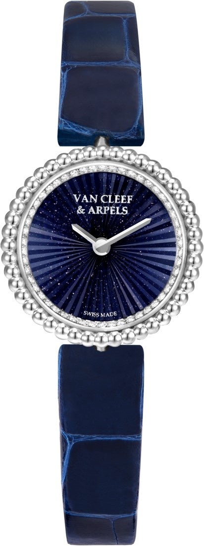 丸みを帯びた輪郭は、輝きを最大限に高めるべく丹念に研磨された2列のゴールドビーズで縁取られています。ゆるやかな凸面を描くクリスタルの下に、装飾が施されたアベンチュリンガラスの文字盤が現れ、そのミッドナイトブルーの色合いは宇宙の深淵を映し出すかのようです。素材には放射状のギヨシェ彫刻が施され、この革新的な技法によって光の相互作用がさらに豊かに引き立てられています。そのまばゆい煌めきは、堅固な針が刻む時の流れに、生き生きとした躍動感を添えます。