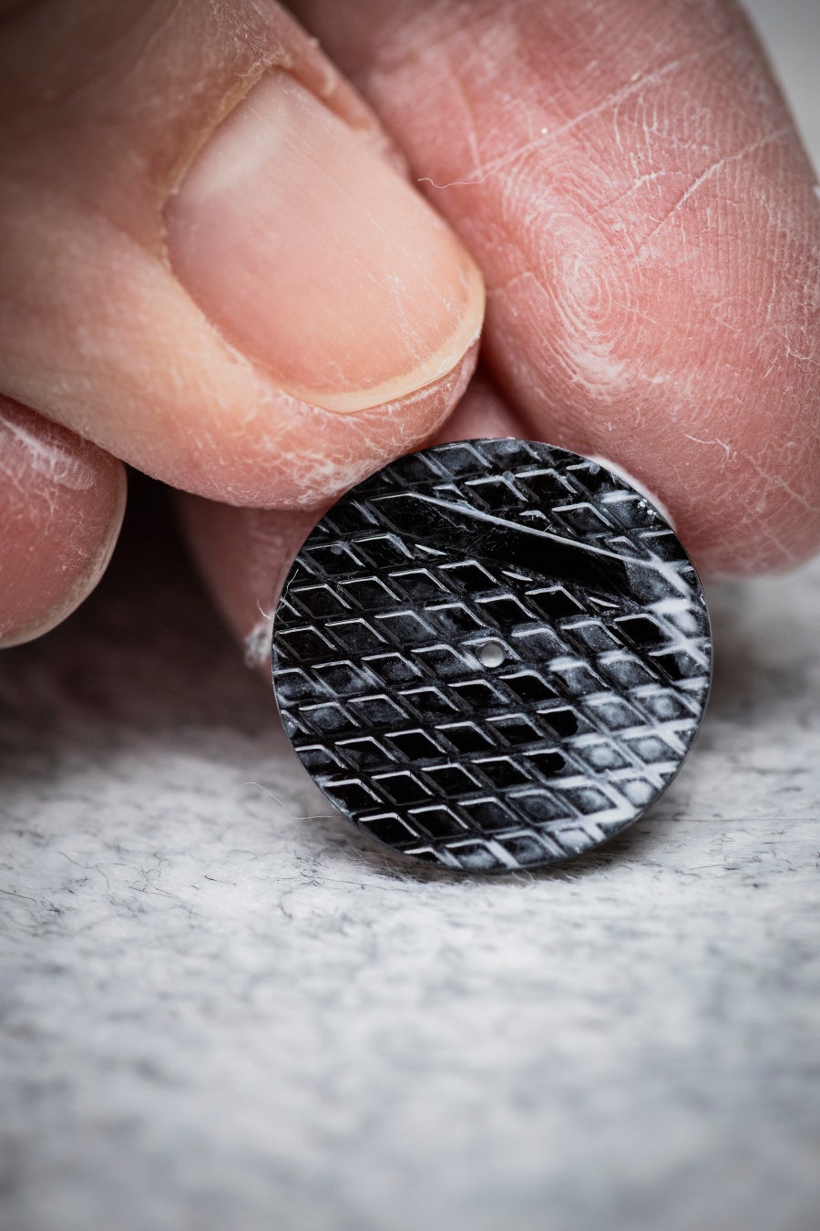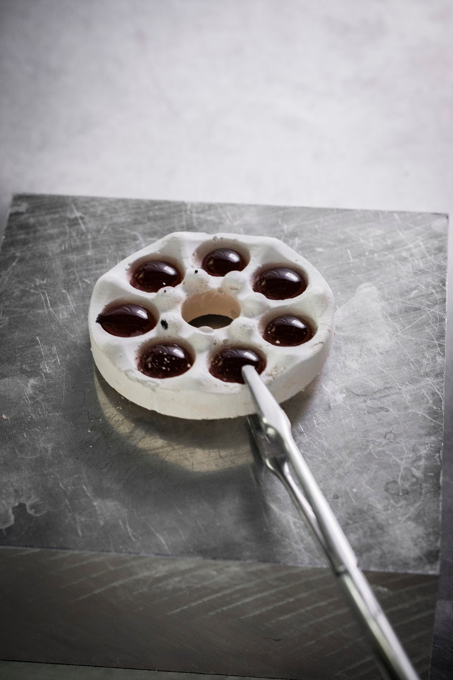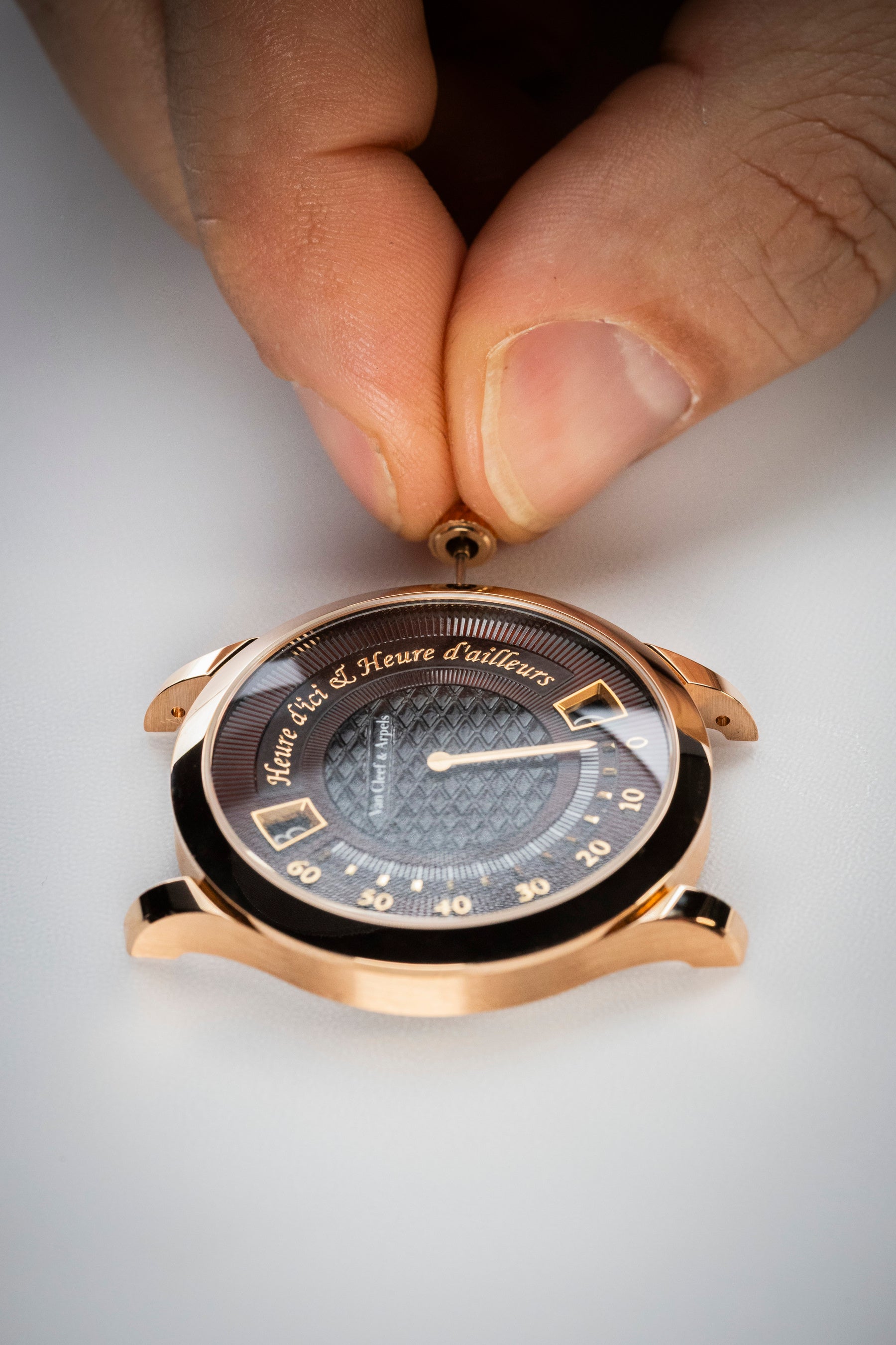 この最初の難題に加え、メゾンのホールマークを想起させるピケモチーフのエナメルへの刻印、外縁に向かって放射状に広がるギヨシェ彫刻といった繊細さを要する作業が並行して進められました。これら2つの装飾に調和の取れた相互作用を生み出すために、エナメルに2つの異なる彩度を持たせることが求められました。塗布したエナメル層の厚みが色調だけでなく、「シャトヤンシー(変彩効果)」と呼ばれる素材内部での光の挙動にも影響を与えるからです。ヴァン クリーフ&アーペルの職人は、レリーフ状のモチーフを表現するため、吹きガラス技法から着想を得て、それを時計制作の道具に応用しました。まず均一に発色させるべく、エナメルを500度以下の低温で30時間以上熱します。その後、高温と1000度を超える超高温での2回の焼成を行うことで気泡を取り除き、成形に適した状態に整えます。成形は、手作業で金型をエナメルに押し当てて行われます。さらに最後の焼成を経て、最終的な成形段階に入ります。
