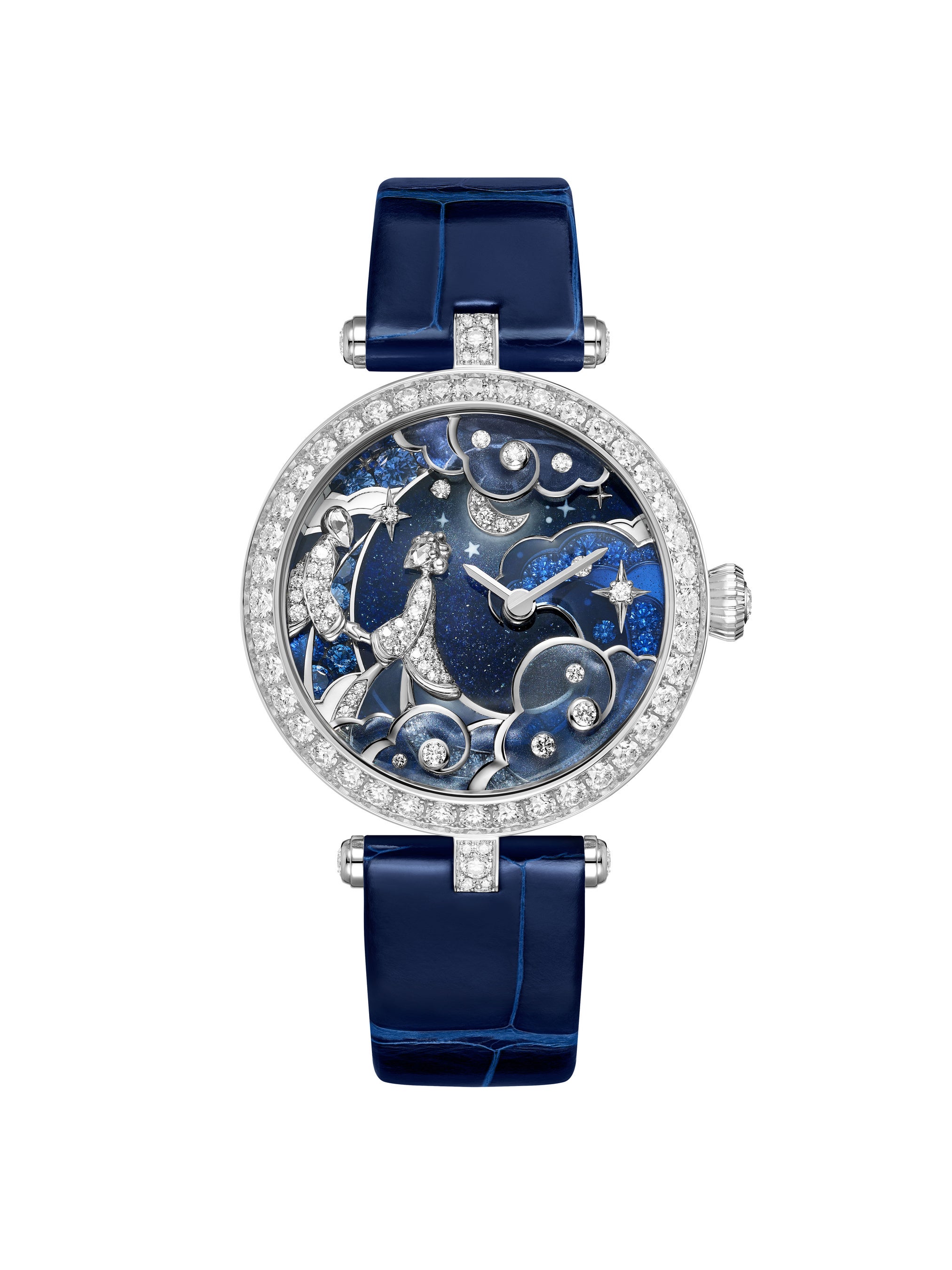 ブルーの色彩が美しく響き合うレディ ランコントル セレスト ウォッチは、星降る夜空を背景に手を取り合う恋人たちの姿を描いています。プリカジュール エナメルにダイヤモンドをちりばめた煌めく雲の向こうに、ホワイトゴールドで象られたシルエットが現れます。ローズカットダイヤモンドで表現された2人の顔から、互いをうっとりと見つめ合う様子をはっきりと伺うことができます。この魅惑的な情景は、ダイヤモンドをセットした月のやわらかな光に照らされています。シャンルヴェ エナメルとグリザイユ エナメルで彩られた文字盤の背景には、繊細なサファイアの三日月が添えられています。ミニアチュール ペインティング技法によって、宝石を留めるビーズにまで色彩が施されています。