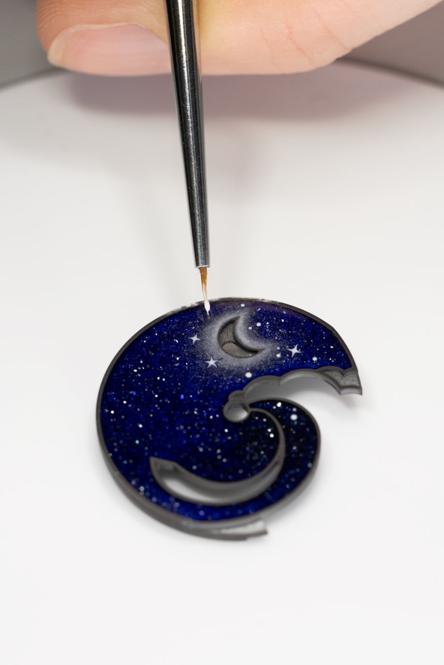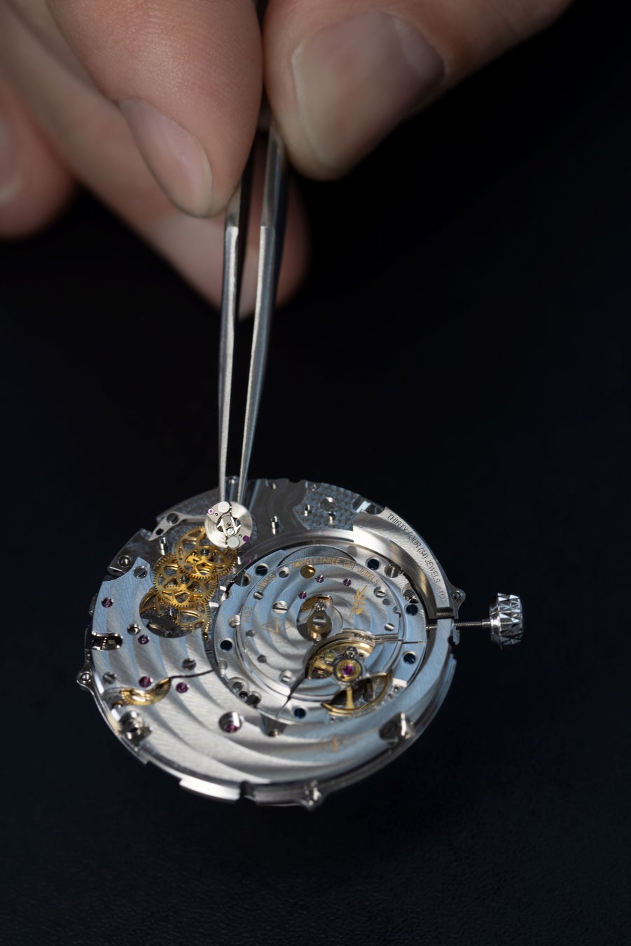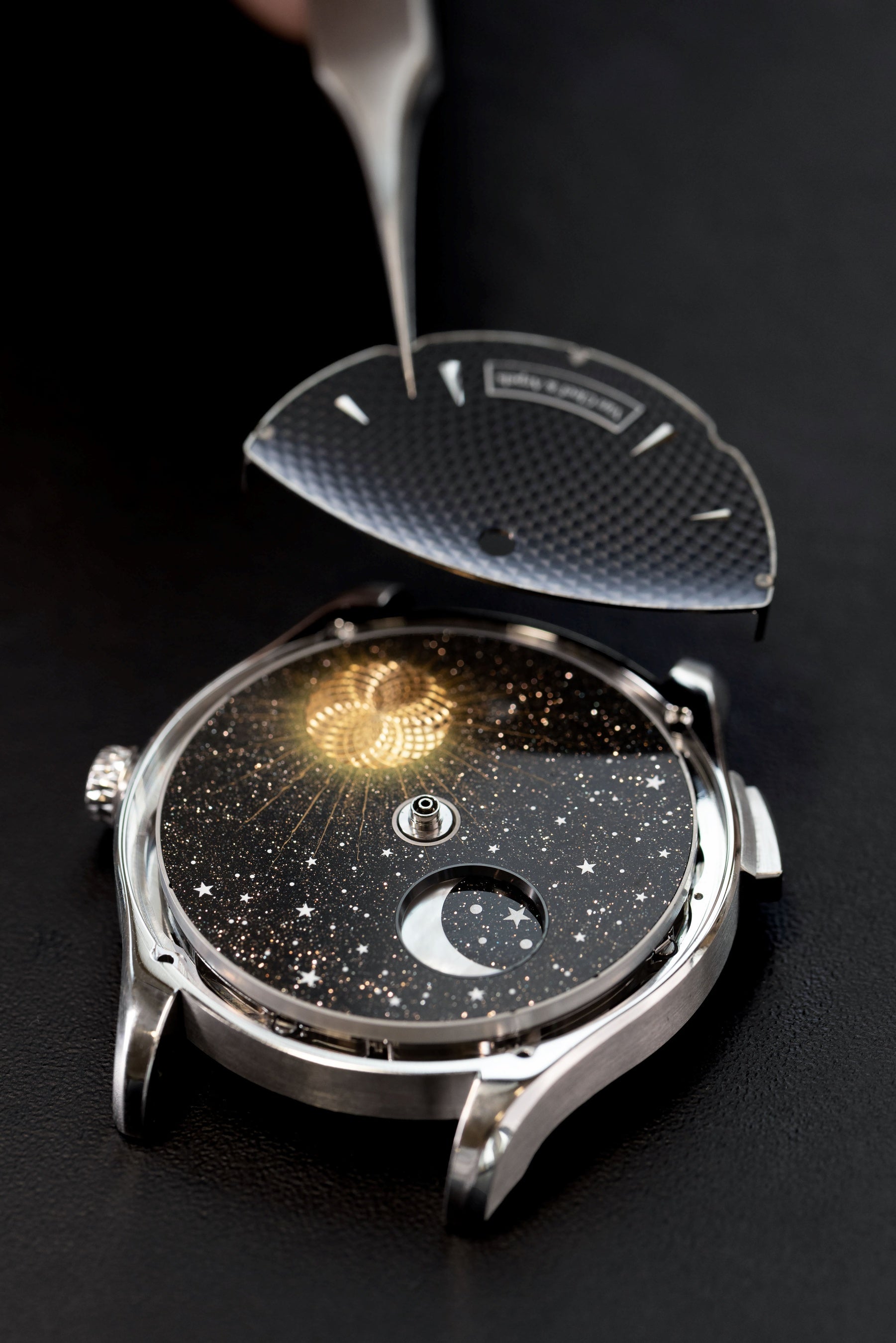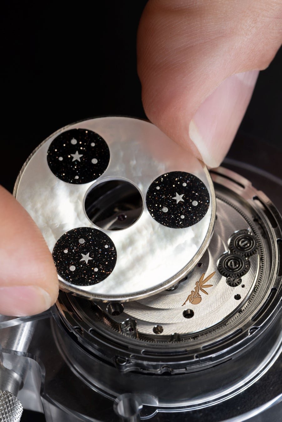 この技術的偉業を成し遂げるには、回転ディスクの重量を極限まで抑え、動きをスムーズにして摩擦を回避する必要がありました。数か月に及ぶ試行錯誤を経て、職人たちは着用者が望む頻度で月相を確認でき、滑らかに作動するオンデマンド アニメーションを実現したのです。また、文字盤を構成する各層を極薄に仕上げることで、作品の世界観を鮮やかに映し出す視覚効果を生み出しました。リューズひとつで操作できる時刻設定やムーンフェイズの調整機構をはじめ、あらゆる面で人間工学に基づいた設計がなされています。