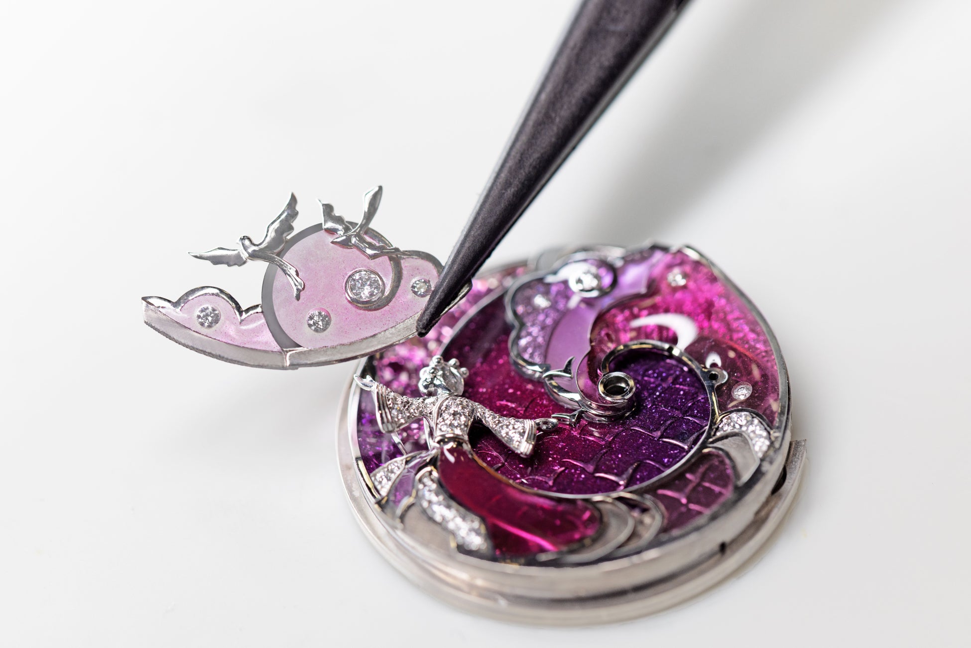 レディ ルトロヴァイユ セレスト ウォッチでは、ピンクとモーヴの優しく煌めくトーンの中に、同じサヴォアフェールが息づいています。シャンルヴェ エナメルで仕上げられた文字盤の背景が、モーヴサファイアの三日月の前に立つ2人の恋人たちの想いをそれとなく伝えています。ホワイトゴールドで彫刻された鳥たちが空中に架ける橋を挟んで、恋しさのあまり互いに腕を伸ばし合う2人は、再会を待ちわびているようです。プリカジュール エナメルによる雲やベール、そしてエナメルの中にセットされたダイヤモンドが、驚くほどの透明感を醸しながら情景を完成させています。