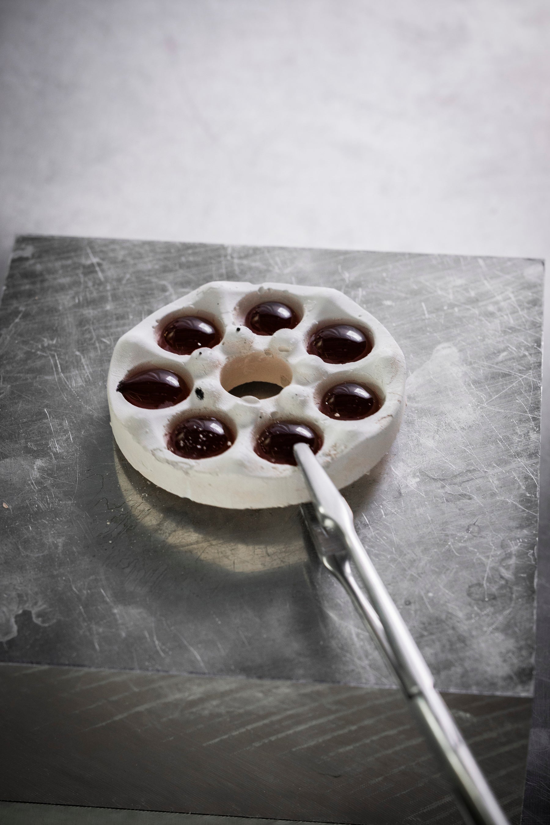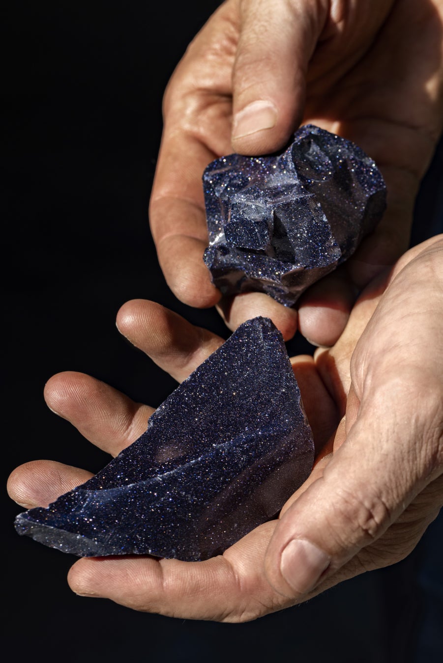 イタリア・ムラーノ島におけるアベンチュリンガラスの製造は、1200度に素材を加熱するところから始まります。るつぼに入れた鉱石のおかげで、ガラスは煌めくような深いブルーを帯びます。るつぼは完全に冷却された後、ハンマーで割られます。この工程だけでも優に1か月を要します。