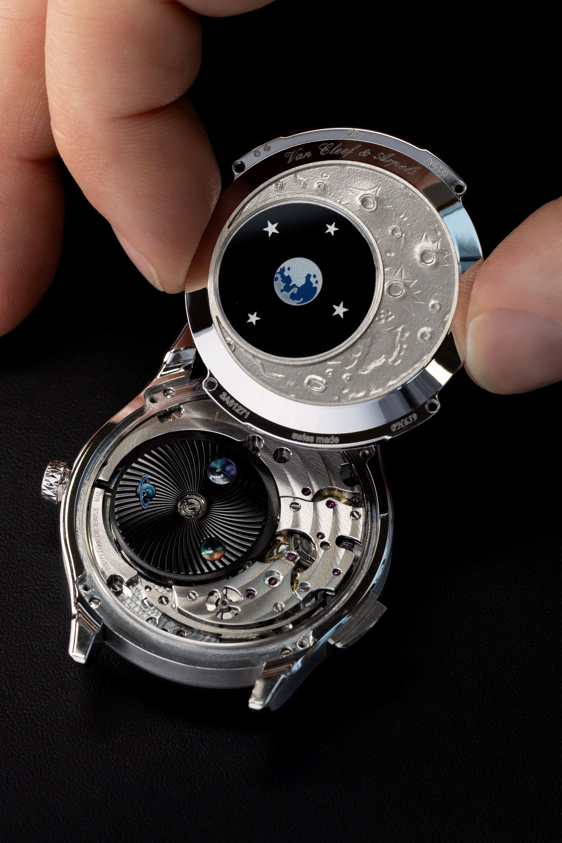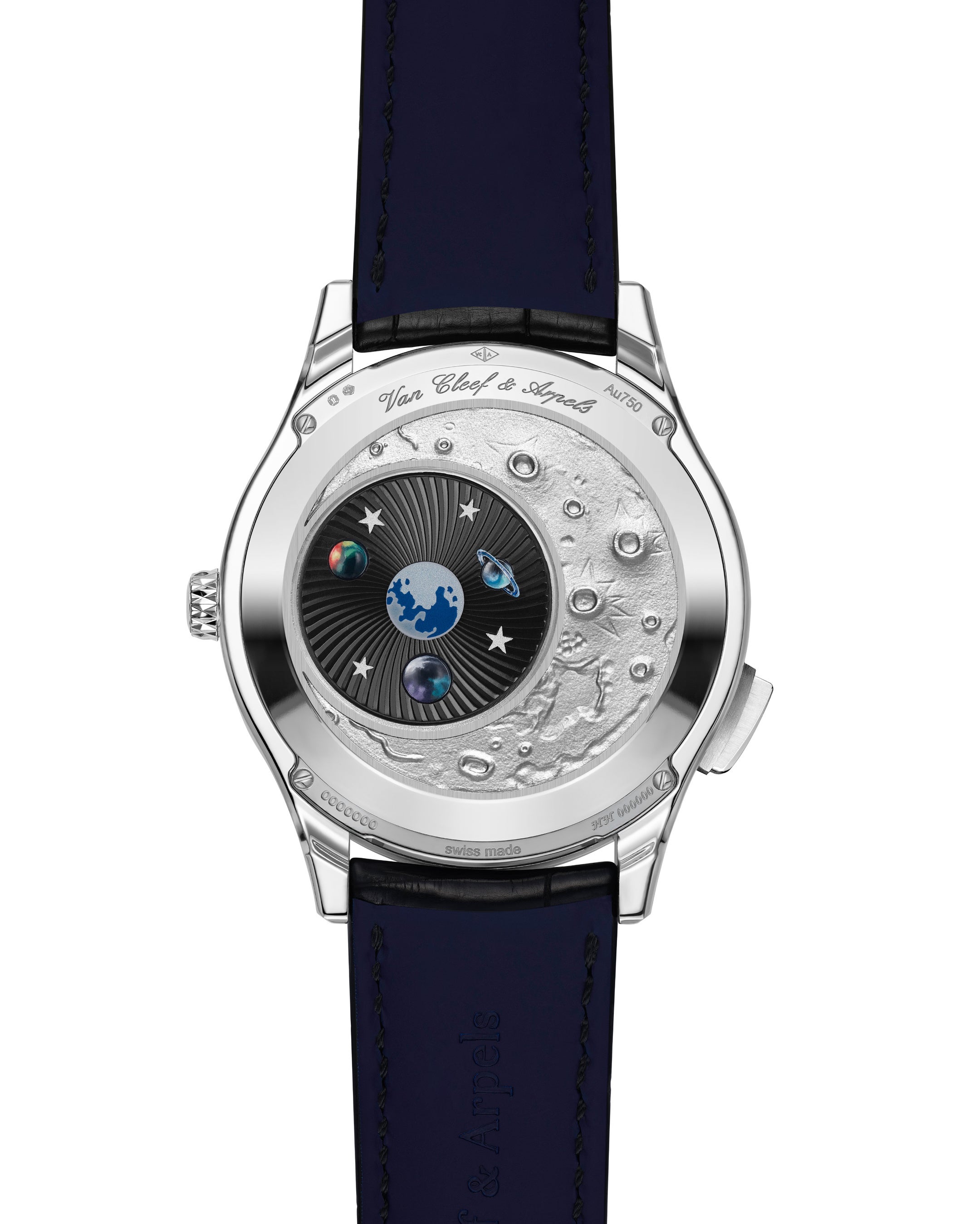 物語は月面を思わせるエングレービングが施されたホワイトゴールド製のケースバックへと続きます。ローターの上部に配置されたサファイアクリスタルには、エナメルで地球が描かれています。クリスタルはさらにミニアチュール ペインティングによる惑星で彩られ、ギヨシェ彫刻を背景にやわらかな輝きを放っています。つまりケースバックには、文字盤に表れた視点を反転させる形で、地球からではなく月から眺めた宇宙の姿が描かれているのです。