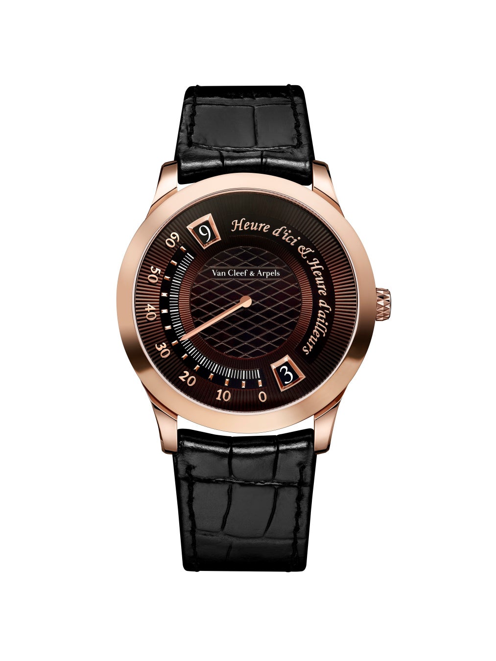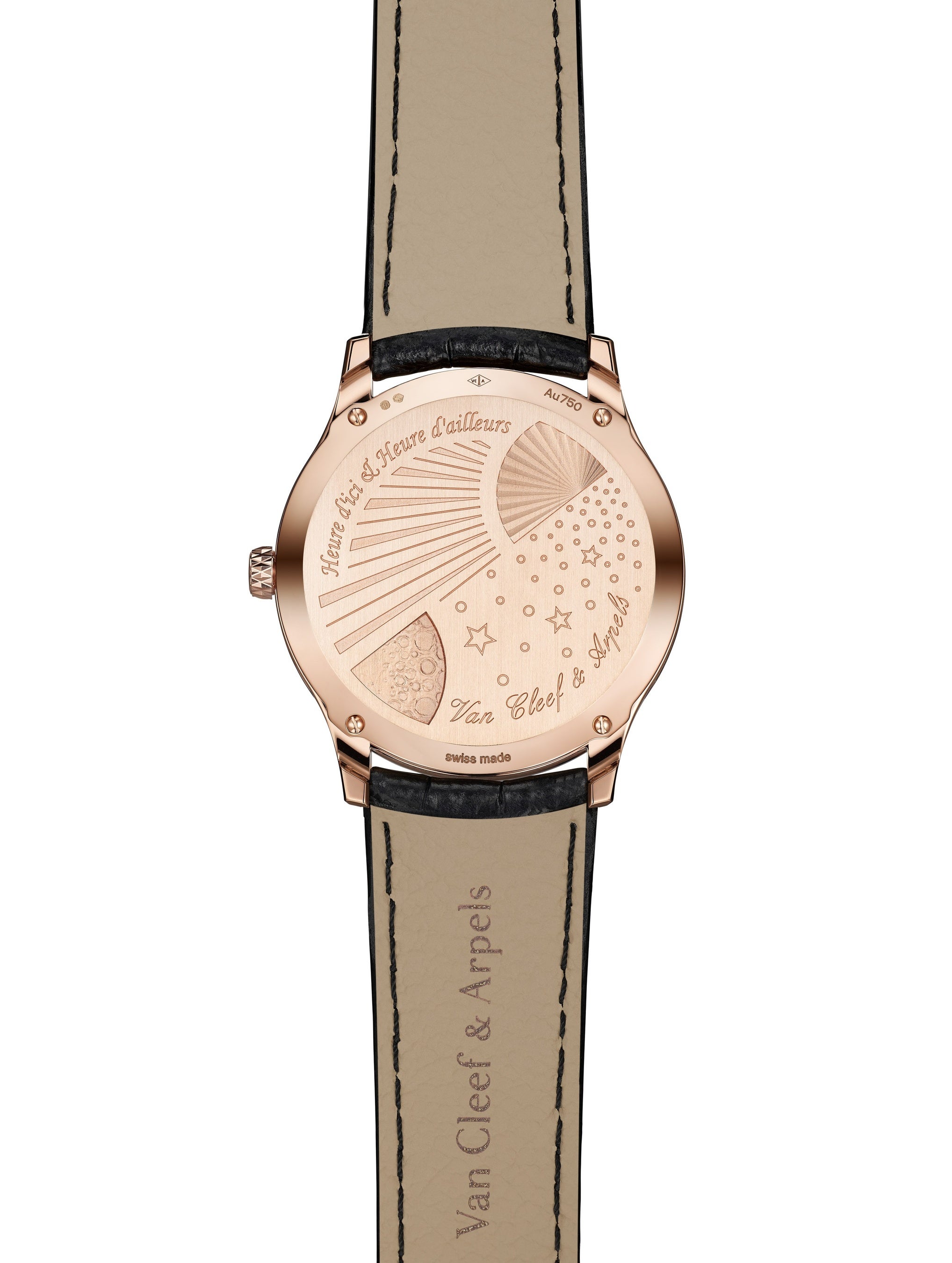 38mmのミッドナイト ケースのデザインは、ケースやアワーマーカーにあしらわれたポリッシュ仕上げとサテン仕上げを施したローズゴールドと、文字盤を構成するレリーフ状のエナメルの繊細な色味とが織りなす調和の取れたバランスが目を引きます。そのブラウンのニュアンスは、光の当たり具合によって温かみのあるアクセントにも冷たいアクセントにも変化します。文字盤には、ヴァン クリーフ&アーペルのひし形のホールマークを想起させるピケモチーフから放射状に広がる、美しいギヨシェ彫刻が施されています。純粋なラインがアシンメトリーな装飾と共鳴し、メゾンのスタイルの真髄を伝えます。流麗な書体で綴られたモデル名は、言葉で表現された詩情へのオマージュとなっています。ケースバックには、ギヨシェ彫刻の太陽の光を浴びる月の姿がエングレービングで描かれています。