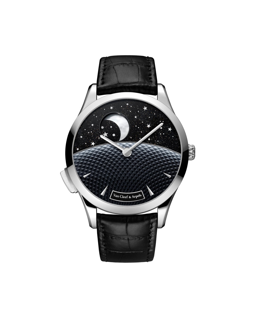 ミッドナイト作品の42mmのホワイトゴールド製ケースの中では、ブラックのムラーノ アベンチュリンガラスが、まるで夜空のように強い輝きを放ちながら文字盤上に広がっています。ヴァン クリーフ&アーペルのイノベーション部門がこの素材の開発に携わり、深みのある色合いと光沢を宿したブロンズの色調を実現することで、夜空の美しさを余すところなく表現しています。1日の移ろいとともに、ギヨシェ彫刻を施したゴールドの太陽が次第に姿を消し、代わって、アクリルで描かれた星々に囲まれたホワイトマザーオブパールの月が現れます。ブラックからホワイトへとグラデーション状にペイントされたギヨシェ彫刻のマザーオブパールによって表現された地平線の彼方に、2つの天体がそれぞれ現れては消えていくのです。日々繰り返される天体の追いかけっこは、ジュール ニュイ ウォッチを特徴づけている24時間回転ディスクの動きによって実現されています。このデイ/ナイト表示は、29.5日という永遠の満ち欠けの周期に呼応して、月の見え方が微妙に変化していくという演出によって引き立てられています。