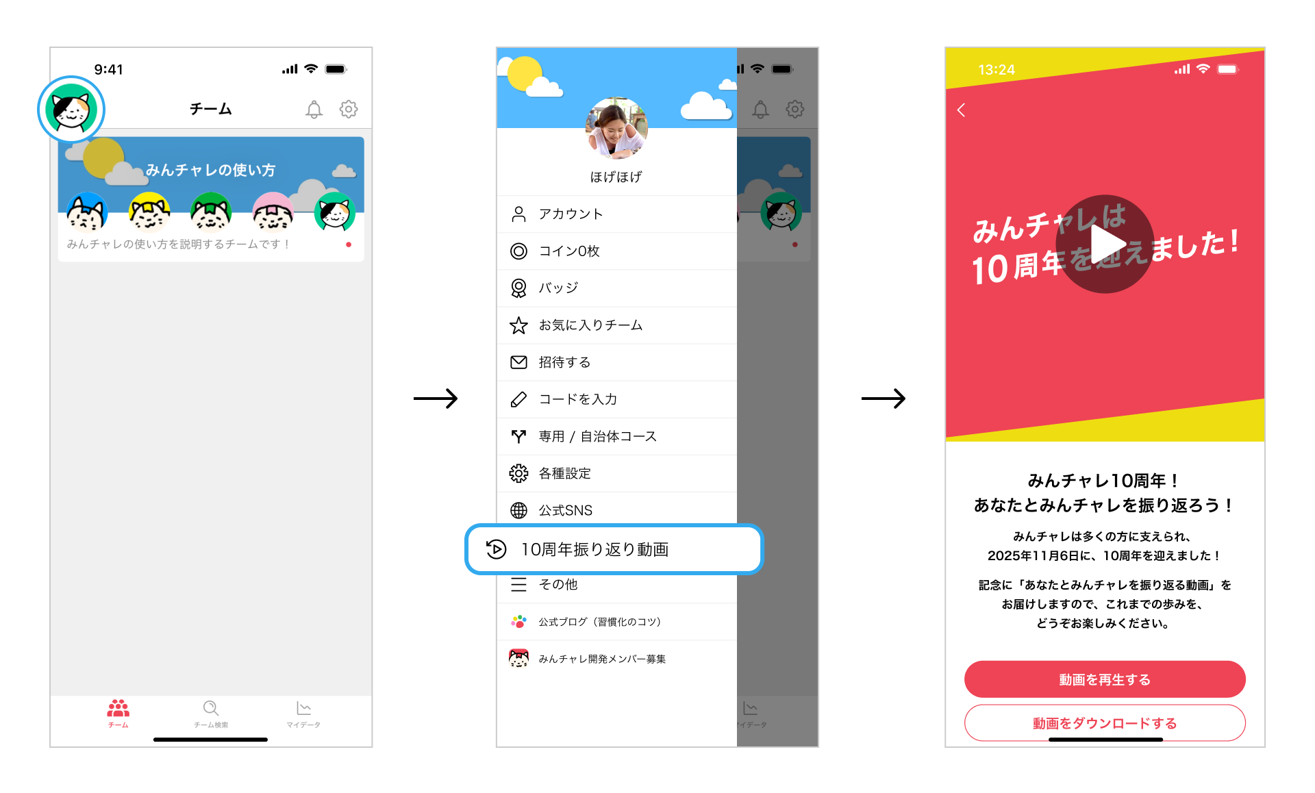 動画はアプリ左上のメニューから、「10周年振り返り動画」を選択することでみることができます。
