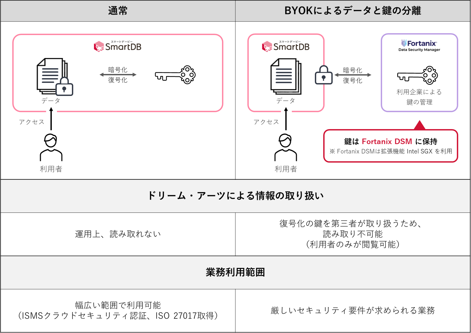 Fortanixが提供する鍵管理サービス(KMS)プラットフォーム「Fortanix データセキュリティマネージャ(以下Fortanix DSM)」とドリーム・アーツが提供する業務デジタル化クラウド「SmartDB(R)(スマートデービー)」の連携でセキュアな情報管理のデジタル化が可能となります。