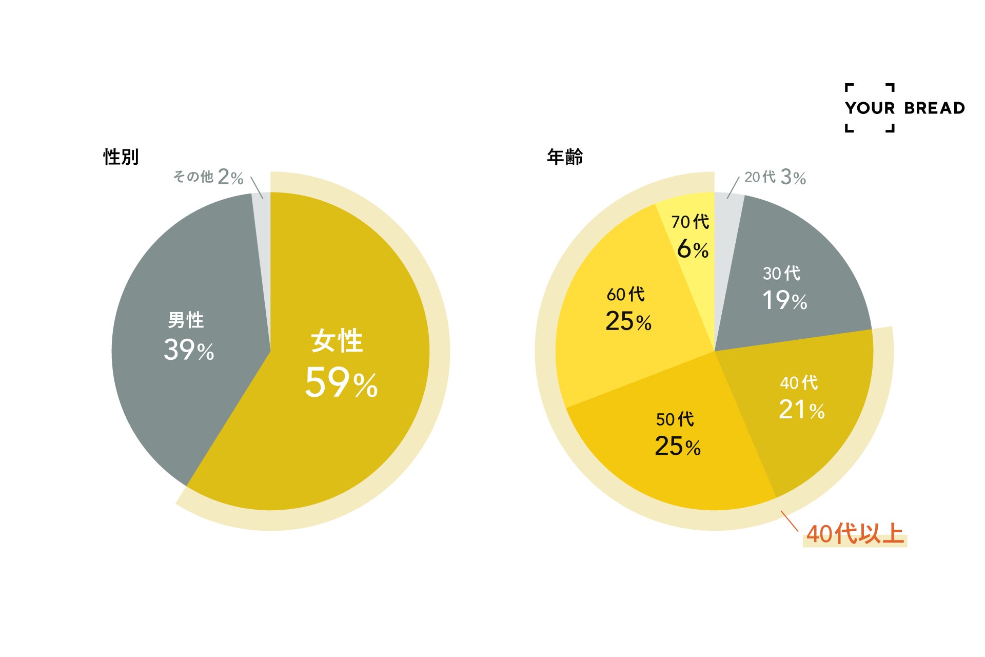 ユアブレッドの定期購入ユーザーをみると、女性が約60%、男性が約40%という結果となりました。年代別にみると、40代以上の定期購入ユーザーが約80%にものぼっています。