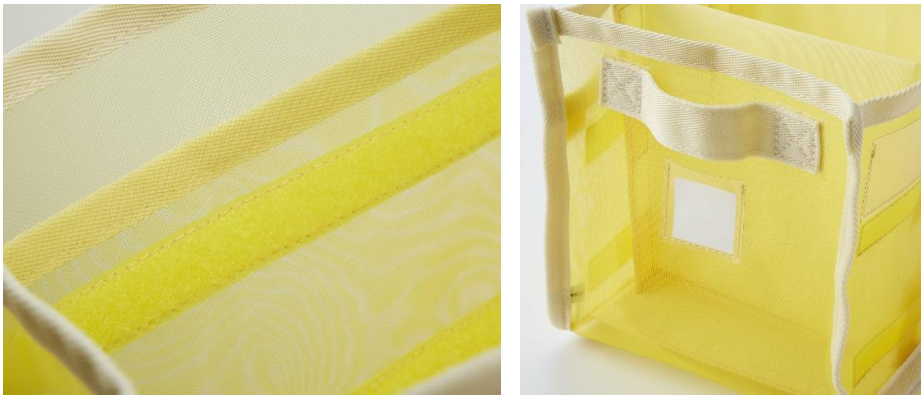 何を入れたのか一目瞭然の全面メッシュの収納ボックスです。「見えなくなったら中身を忘れてしまう」 という声から生まれたアイテムです。位置調整できる仕切り付きで、内容や名前をカードに書き込めば家族で使い分けもできます。持ち運びしやすい持ち手も付いています。