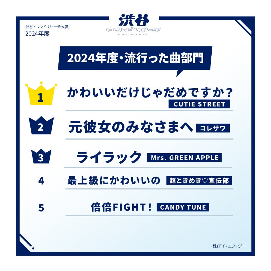 「KAWAII LAB.」から誕生した女性アイドルグループ「CUTIE STREET」の「かわいいだけじゃだめですか?」 が流行った曲部門1位を獲得。TikTokを中心に音源を使用し投稿する人が続出し、「かわいい」を象徴する存在として人気を博しました。2024年は自己肯定感があがるような「かわいさ」をテーマにした楽曲にハマる高校生が多い傾向となりました。