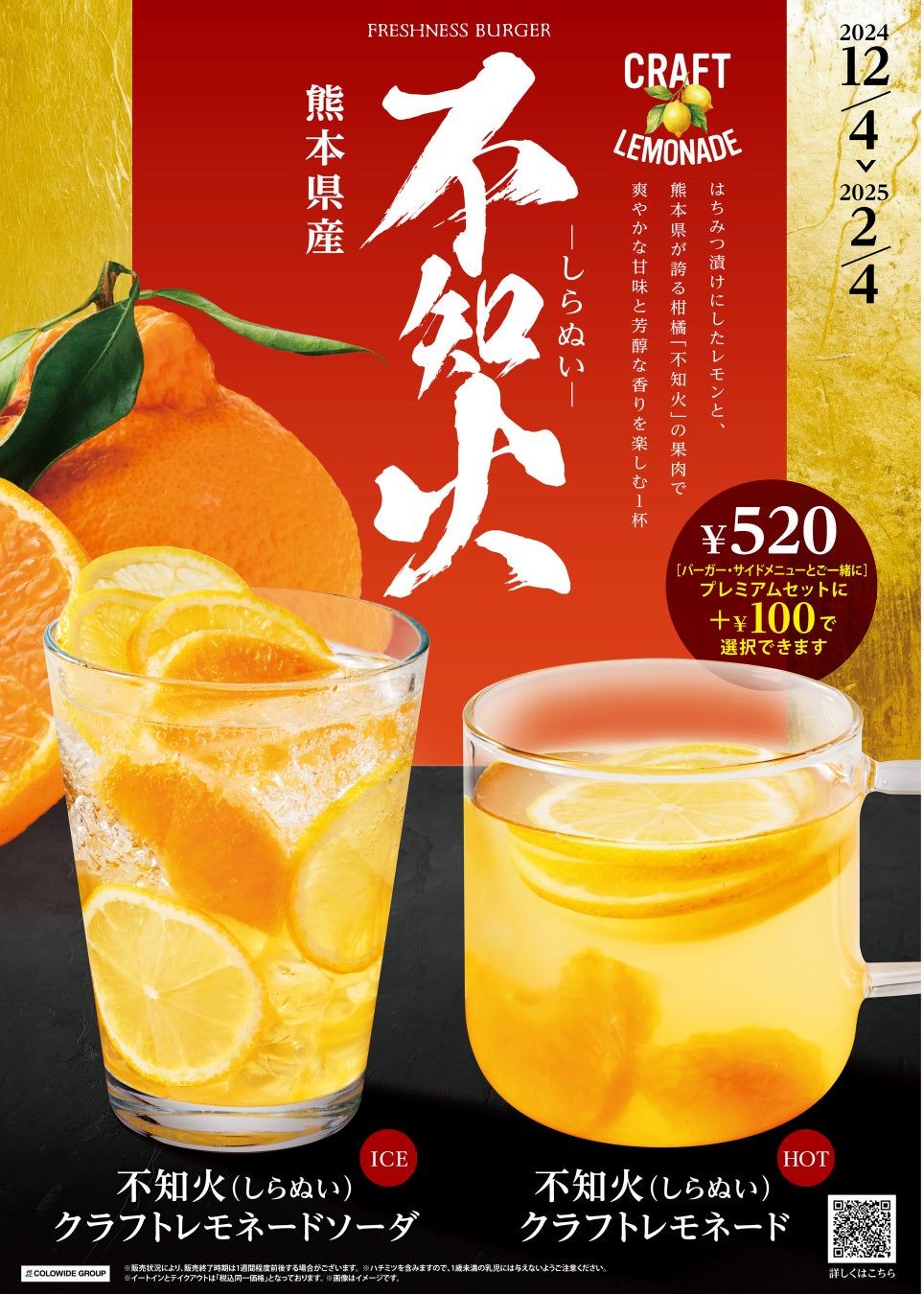 シリーズ累計50万杯以上を販売したクラフトレモネードシリーズより、熊本県産の柑橘“”が初登場。店内でじっくりとはちみつに漬け込んだレモンと“”の果肉、シロップを合わせました。すっきりとフルーティーな甘みと芳醇な香り、レモンの酸味が爽やかな一杯です。神戸牛バーガーや紀州南高梅マヨディップポテトと合わせてお楽しみいただけます。