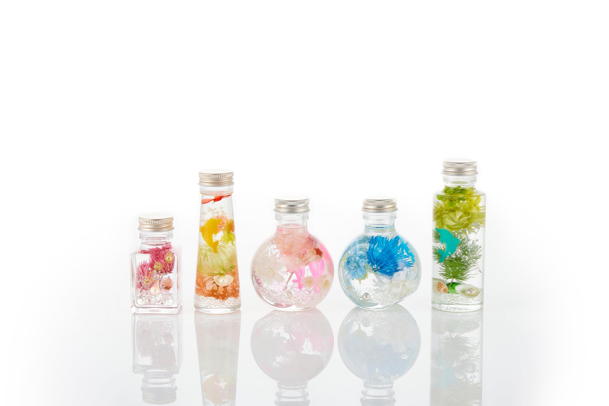 ハーバリウム(Herbarium)とは「植物標本」「植物標本室」のことで、ガラス瓶の中にプリザーブドフラワーやドライフラワーなどの花材を入れ、専用のオイルに浸し観賞用に保存したものです。 本物の花を使うところが特徴で、透過光による美しい輝きと浮遊感を楽しめます。