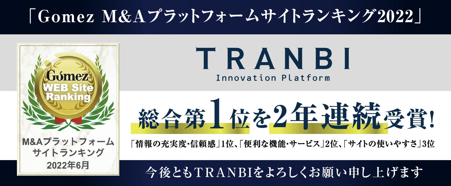 株式会社トランビ(本社:東京都港区、以下「トランビ」)は、「Gomez M&Aプラットフォームサイトランキング2022」にて「TRANBI」が2年連続で総合第1位を獲得したことをお知らせいたします。カテゴリ別で「情報の充実度・信頼感」1位、「便利な機能・サービス」2位、「サイトの使いやすさ」3位となっており、総合的にバランスの取れた評価をいただきました。