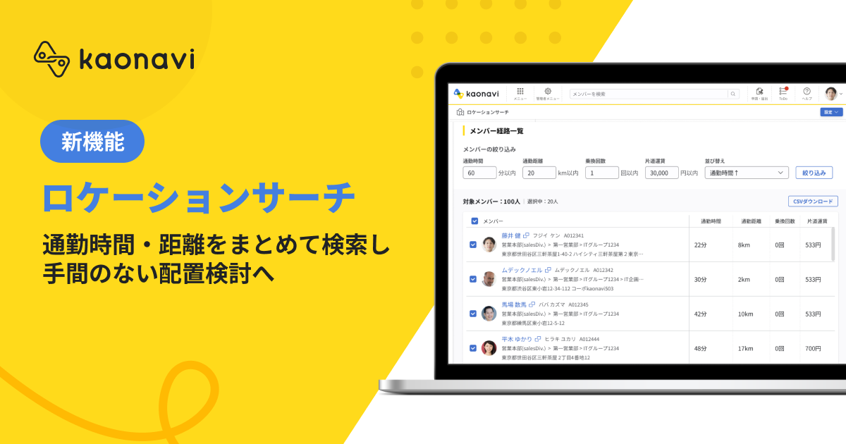 【カオナビ】社員の通勤時間をまとめて簡単に検索 新機能「ロケーションサーチ」を提供開始