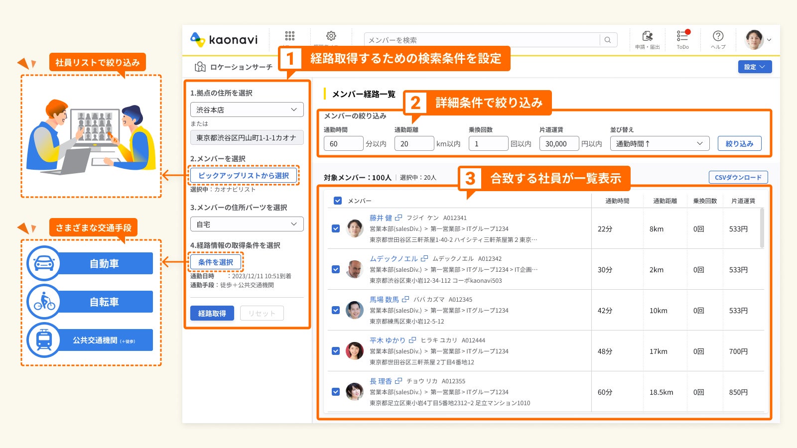 あらゆる交通手段を検索できるだけでなく、通勤時間や乗り換え回数、交通費も確認可能。異動候補者の通いやすさを多面的に検討できます。