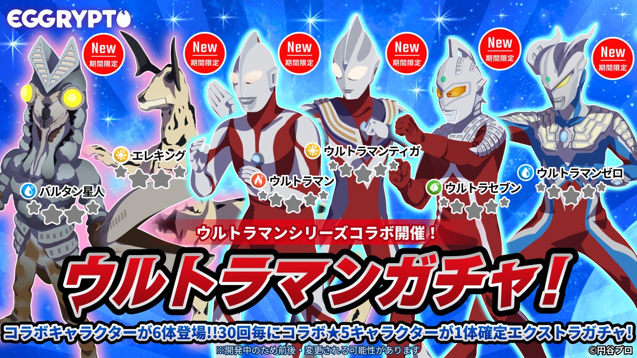 本コラボイベントでは、「ウルトラマンシリーズ」の人気キャラクターが期間限定のガチャに登場するほか、コラボクエスト限定のイベントモンスターが複数登場いたします。この機会にぜひEGGRYPTOをお楽しみください。