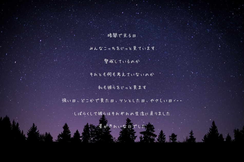 目があったのは数秒でしたが、それぞれの猫たちの生活が愛おしく、その瞬間を描き、猫たちの頭上にはシリウスやオリオン座が光っています。