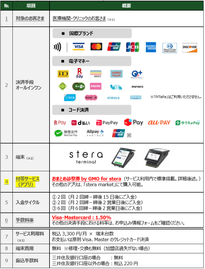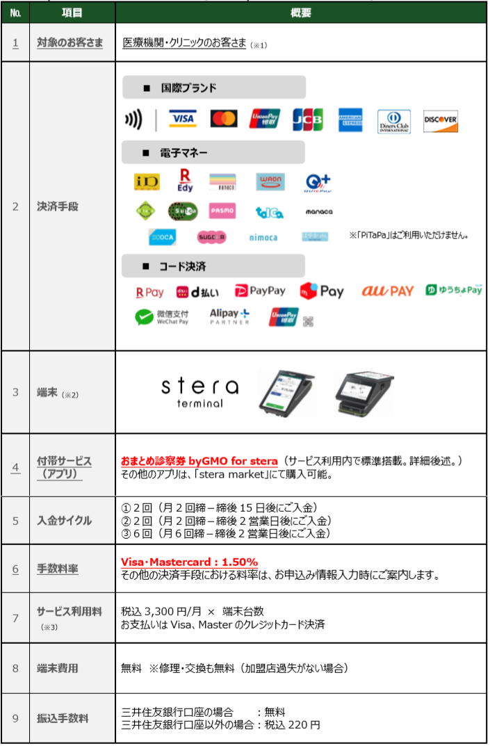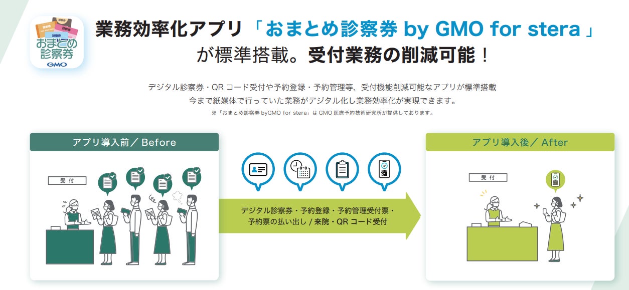 この度、開始しました医療機関・クリニックのお客さま向けの新サービス「stera pack for クリニック」の特徴は、①診察の受付・予約管理を行うことができるアプリ「おまとめ診察券byGMO for stera」をサービス利用料内で標準搭載している点、②決済手数料率を医療機関向けに、業界最安水準の1.50%~に設定した点の2点です。