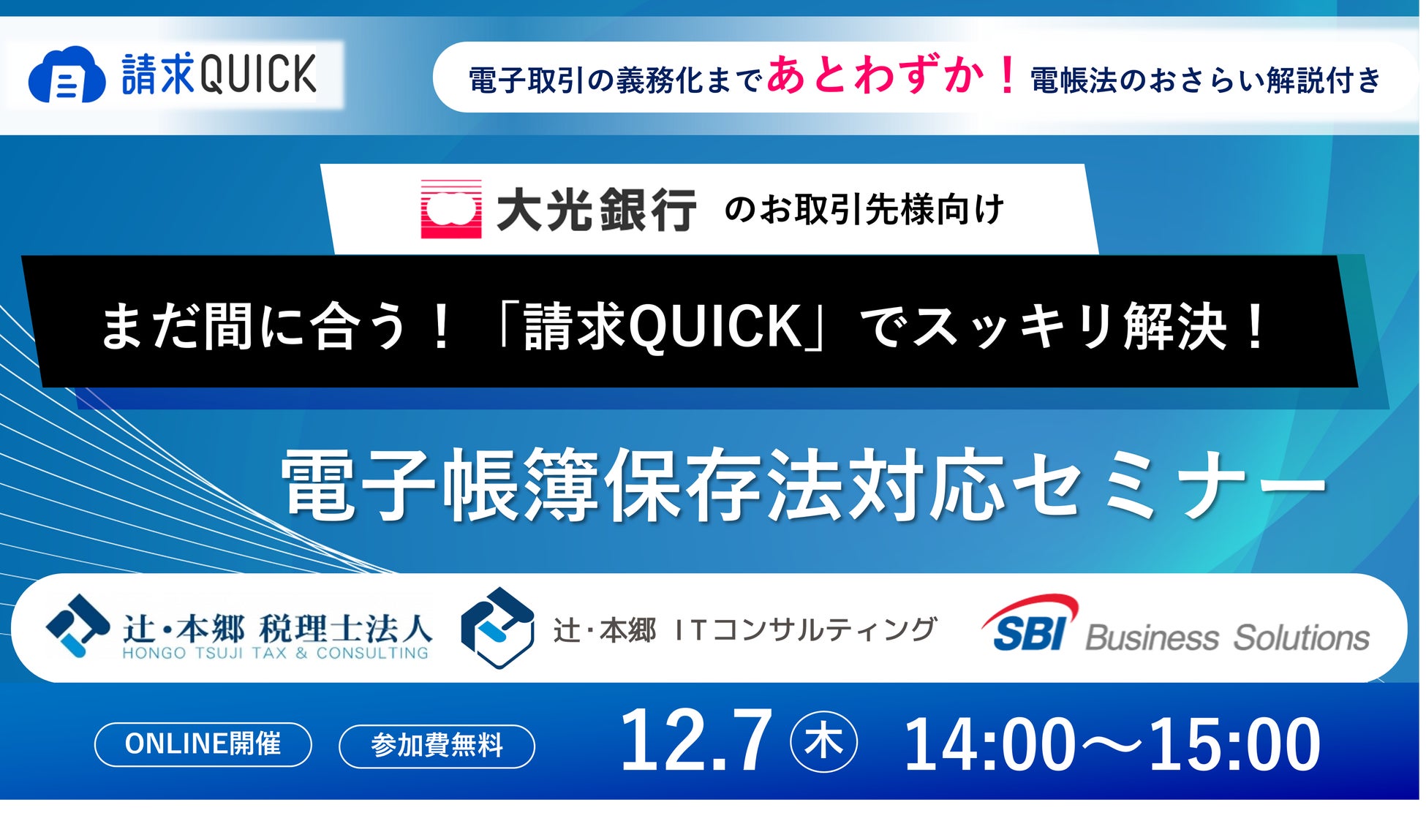 当社はSBIグループが推進する地方創生の取り組みの一環として、多くの地域金融機関と提携し顧客である地域の中小企業向けに、初期費用・月額費用0円から始められるインボイス制度・改正電帳法対応が可能なクラウド型請求書管理システム「請求QUICK」の導入を相互協力のもと推進しております。大光銀行は、「請求QUICKパートナープログラム」にもパートナー企業としてご参加いただき、これまでも多くのお客様に「請求QUICK」をご案内いただいております。このたびの「電子帳簿保存法対応セミナー」は、ITツール活用による地域企業のDX課題の解決に向け、大光銀行、辻・本郷グループ、および当社が相互協力のもと、地域経済の発展を目指す取り組みの一つであり、今後も当社はこうした活動を全国に広げていく予定です。