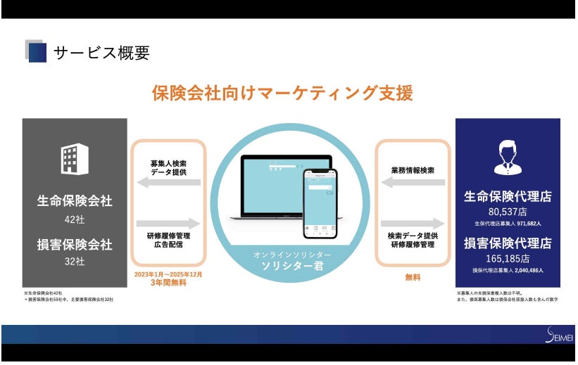 ※SEIMEI社がSOM1として定義する「保険プラットフォーム」事業ドメインは、以下の生命保険会社全42社及び主要損害保険会社32社が運営する業務領域及び、その保険商品を取り扱う保険代理店の業務領域の全てを指します。