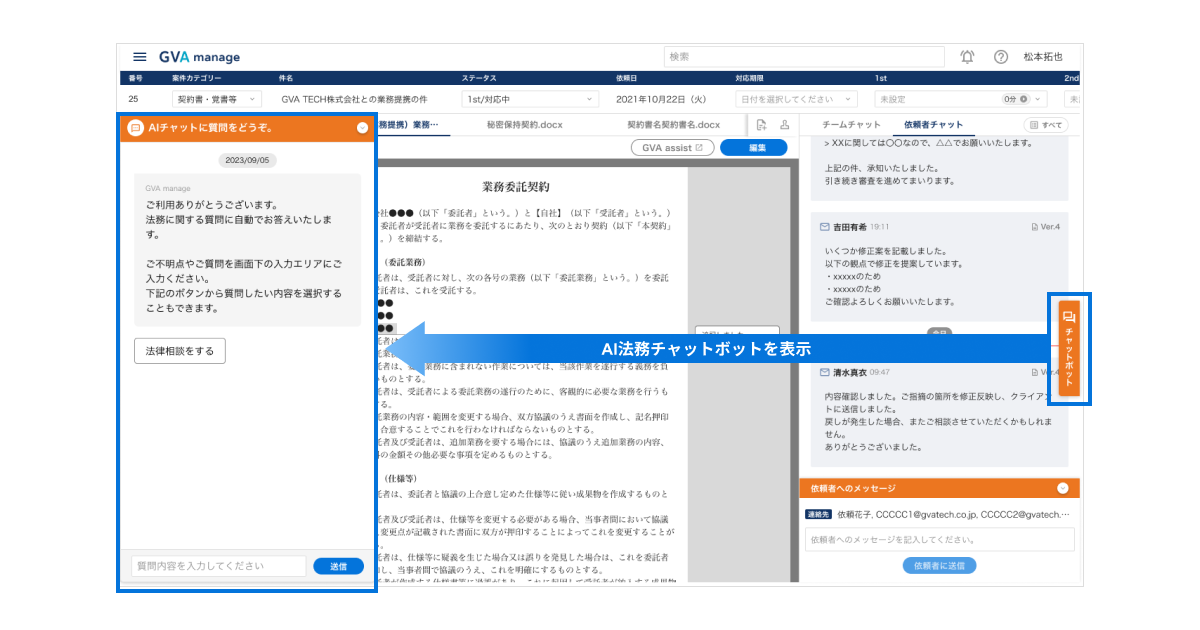 これらの法律相談のQAデータベースの「質問」と「回答」については、GVA manage上のAI法務チャットボットで自然言語で質問をすると、自動で類似の「質問」と「回答」を呼び出すことが可能です。