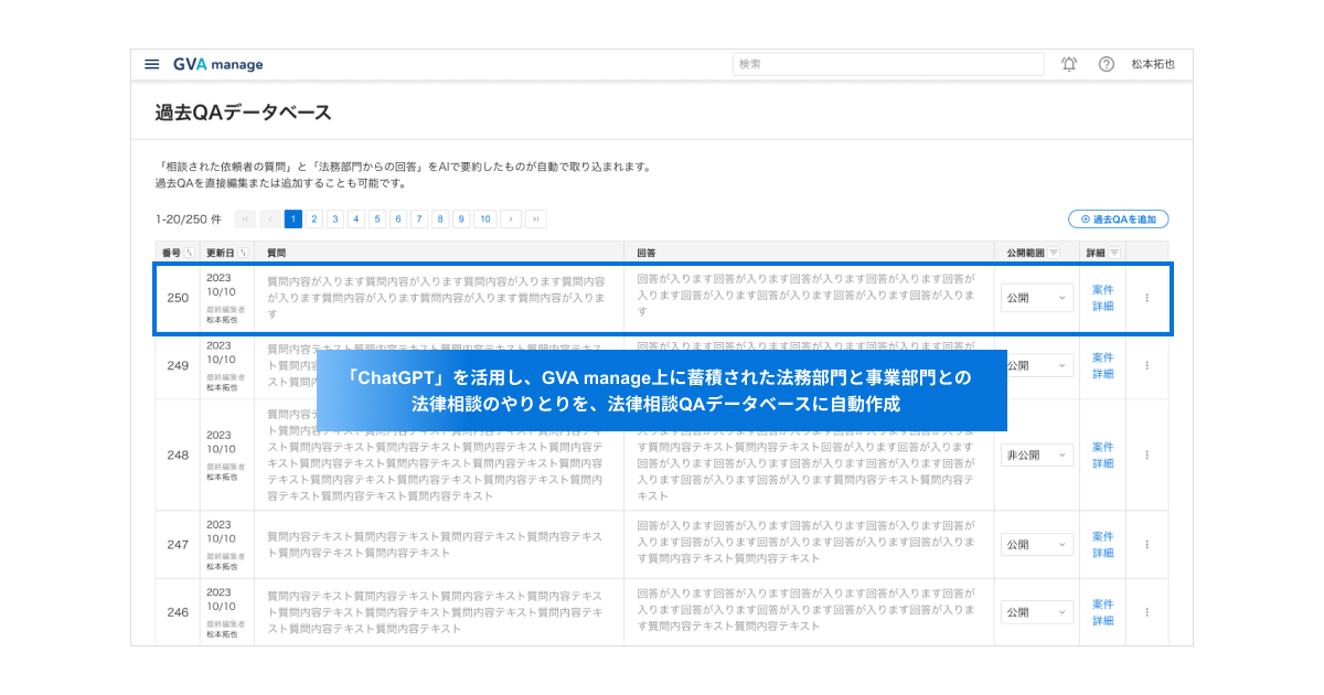 GVA manageで蓄積された法律相談のやりとりについて、「ChatGPT」が自動で「質問」と「回答」に要約して法律相談QAデータベースに格納されます。この「質問」と「回答」は法務部門で編集することも可能です。