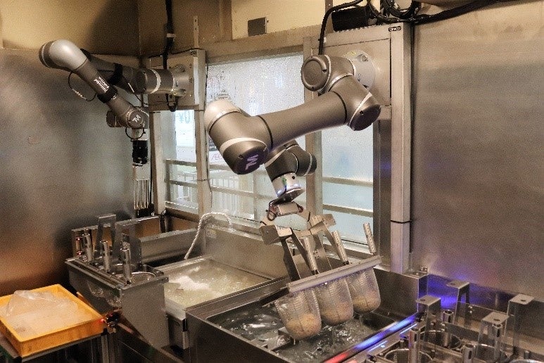 1本目のロボットアームが生そばを番重(仕切り付容器)から取出しテボ(茹で用ザル)へ投入し、その後、2本目のロボットアームにより茹でる、洗う、締めるという一連の調理工程を行います。