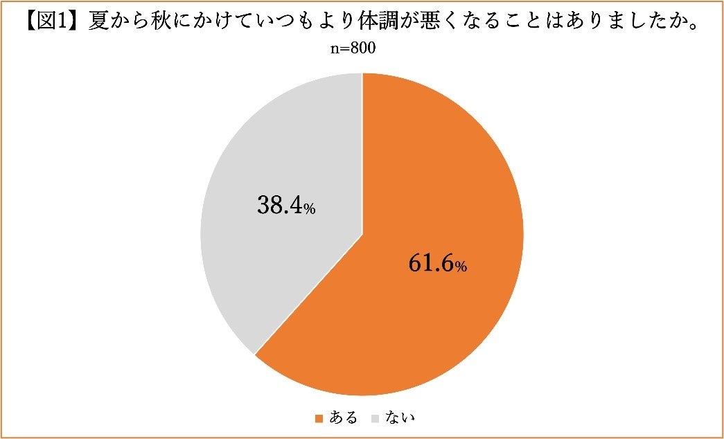まず、夏から秋にかけていつもより体調が悪くなるかを確認したところ、61.6%の方々が悪くなった経験があると答えた(図1)。