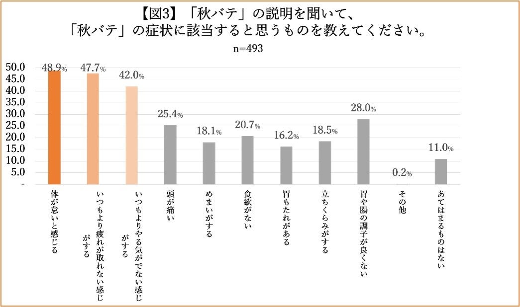 秋にかけての不調経験者に具体的な秋バテの症状を伝え、該当する症状を伺うと、「体が怠いと感じる(48.9%)」「いつもより疲れが取れない感じがする(47.7%)」「いつもよりやる気がでない感じがする(42.0%)」という回答が他の回答に比べ約15%高い結果となった(図3)。