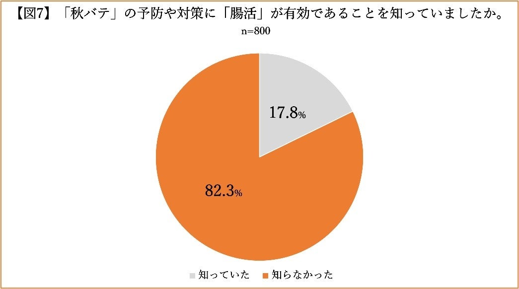秋バテの予防や対策に、腸内環境を整えることで自律神経を整える「腸活」が効果的であると知らない人は、82.3%と8割以上の方々が知らないという結果となった(図7)。