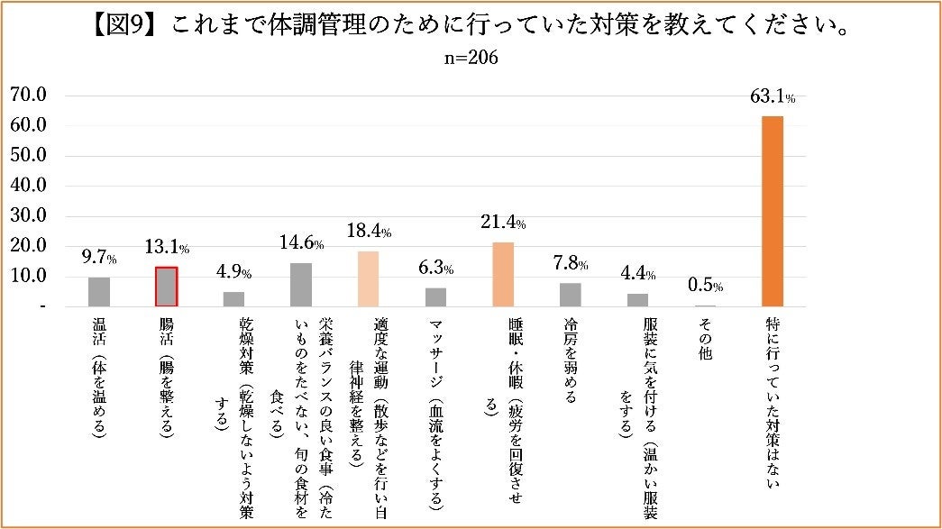 夏から秋にかけての不調未経験者に、体調管理のために行っていた対策を聞くと、「特に行っていた対策はない(63.1%)」がもっとも多く、半数以上の方々が「秋バテ」の予防ができていないことがわかった。さらに、秋バテに有効な「腸活」を行っている方は13.1%という結果となり、日頃から、秋バテの対策をはじめ、体調管理の対策ができていないことから、今後の「秋バテ予備軍」の可能性があることがわかった(図9)。