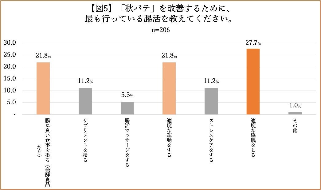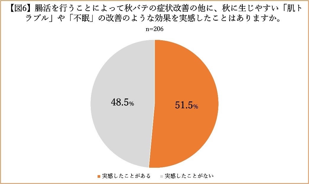 ちなみに、夏から秋にかけての不調経験者のうち体調改善のために腸活に取り組んだことがある方に、最も行った腸活を伺うと「適度な睡眠をとる(27.7%)」「腸に良い食事を摂取する(21.8%)」「適度な運動をする(21.8%)」が上位を占め、その他の腸活と比べ10%以上高い結果となった(図5)。一方で、腸活を行うことで秋に生じやすい肌トラブルや不眠の改善につながったと実感した人が51.5%と約半数の結果に(図6)。