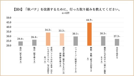 夏から秋にかけての不調経験者に体調改善のために行った取り組みのうち、効果があった実感した取り組みを伺うと、「睡眠・休暇(44.9%)」という結果となり、その後に続く「栄養バランスの良い食事(34.2%)」「適度な運動(33.3%)」より、約10%も多い結果となった(図4)。