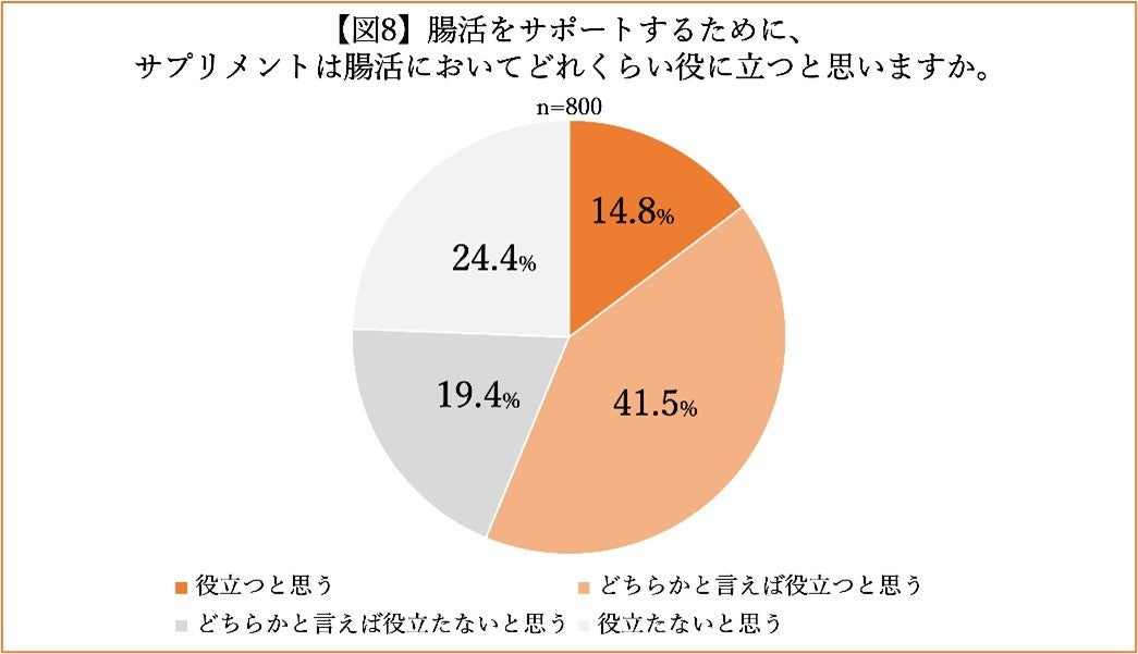 ちなみに、腸活をしようと思ったときに、サプリメントの使用は役に立つと思うかを伺うと、役に立つと回答した方々が56.3%と、半数以上の結果となった。この結果から、約半数の方がサプリメントで腸活を行うことに前向きであることがわかった(図8)。