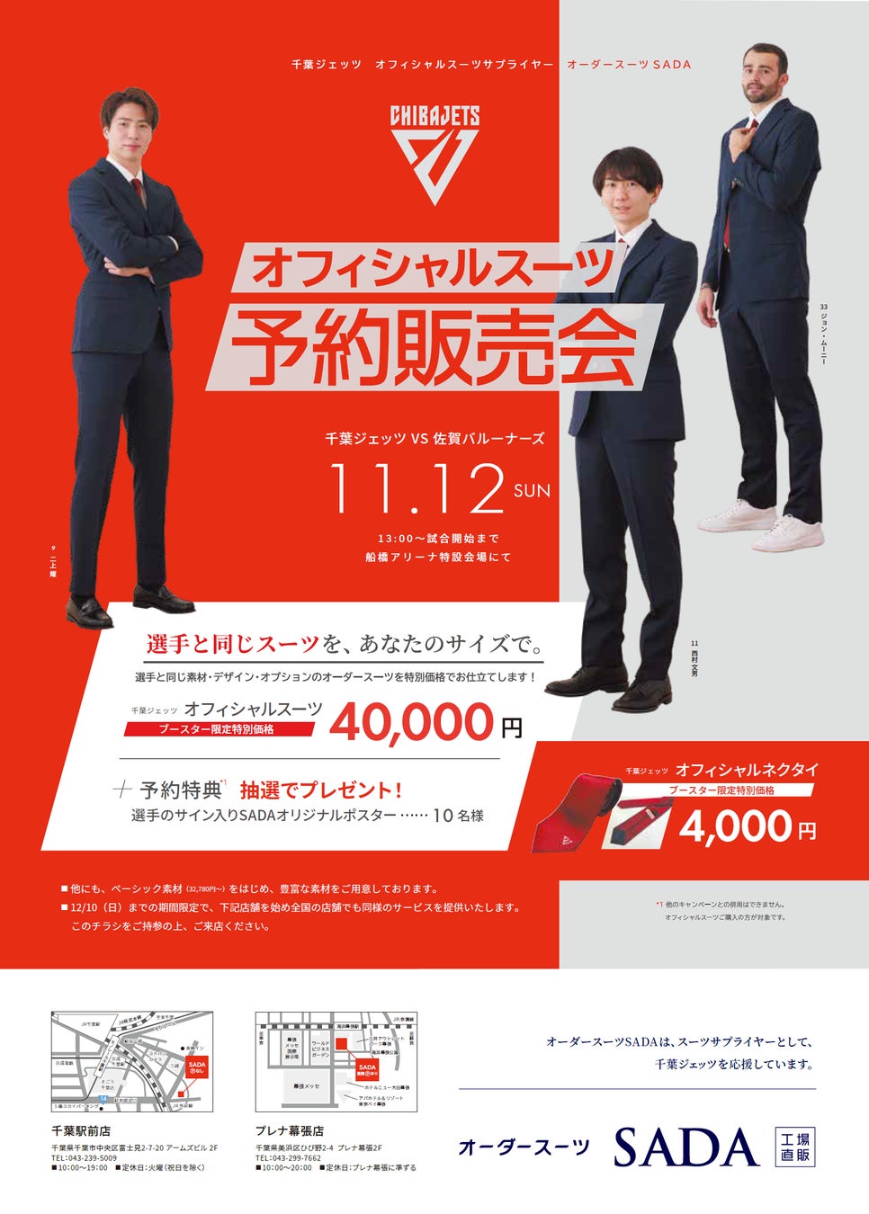 「千葉ジェッツ」 オフィシャルスーツサプライヤー オーダースーツ SADAオフィシャルスーツ予約販売会 11 月 12 日(日)開催