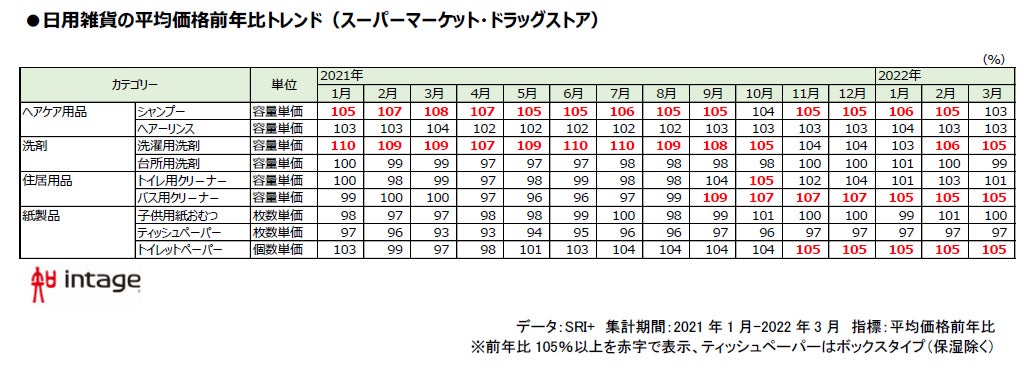 株式会社インテージ(本社:東京都千代田区、代表取締役社長:檜垣 歩、以下インテージ)は、全国約6,000店舗より収集している小売店販売データ、SRI+®(全国小売店パネル調査)をもとに、原油や原料費の高騰が続き日用消費財メーカーなどが商品の値上げを発表する中で、生活者がどのような影響を受けているのか、実際に購入をする店頭販売価格の値上げについて調査しました。