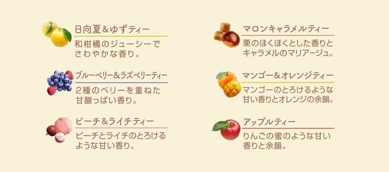 飲用目的として、「リラックスしたいとき」や「おやつ代わりに楽しみたい」といったお客様のご意見を参考に新フレーバーとして和柑橘フレーバーの「日向夏&ゆずティー」とスイーツタイプのフレーバー「マロンキャラメルティー」が加わりました。その日の気分で選んで楽しめる、6種類のフレーバーが2袋ずつ入った商品です。