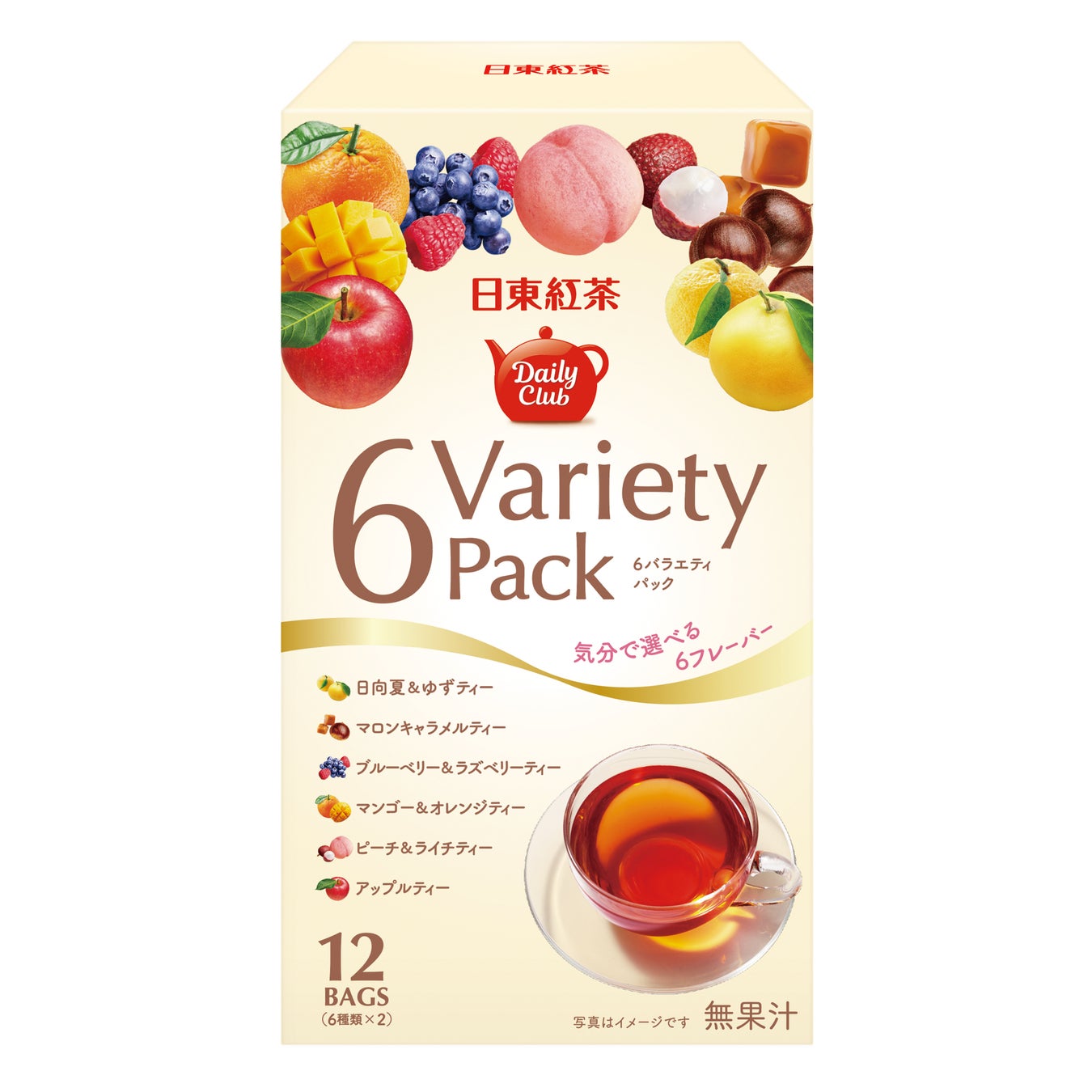 6バラエティパックは「日東紅茶 デイリークラブ」シリーズのフレーバーティーのアソートパック商品として、色々なフレーバーと紅茶の味わいが一緒に楽しめる長年にわたりご好評いただいている商品です。