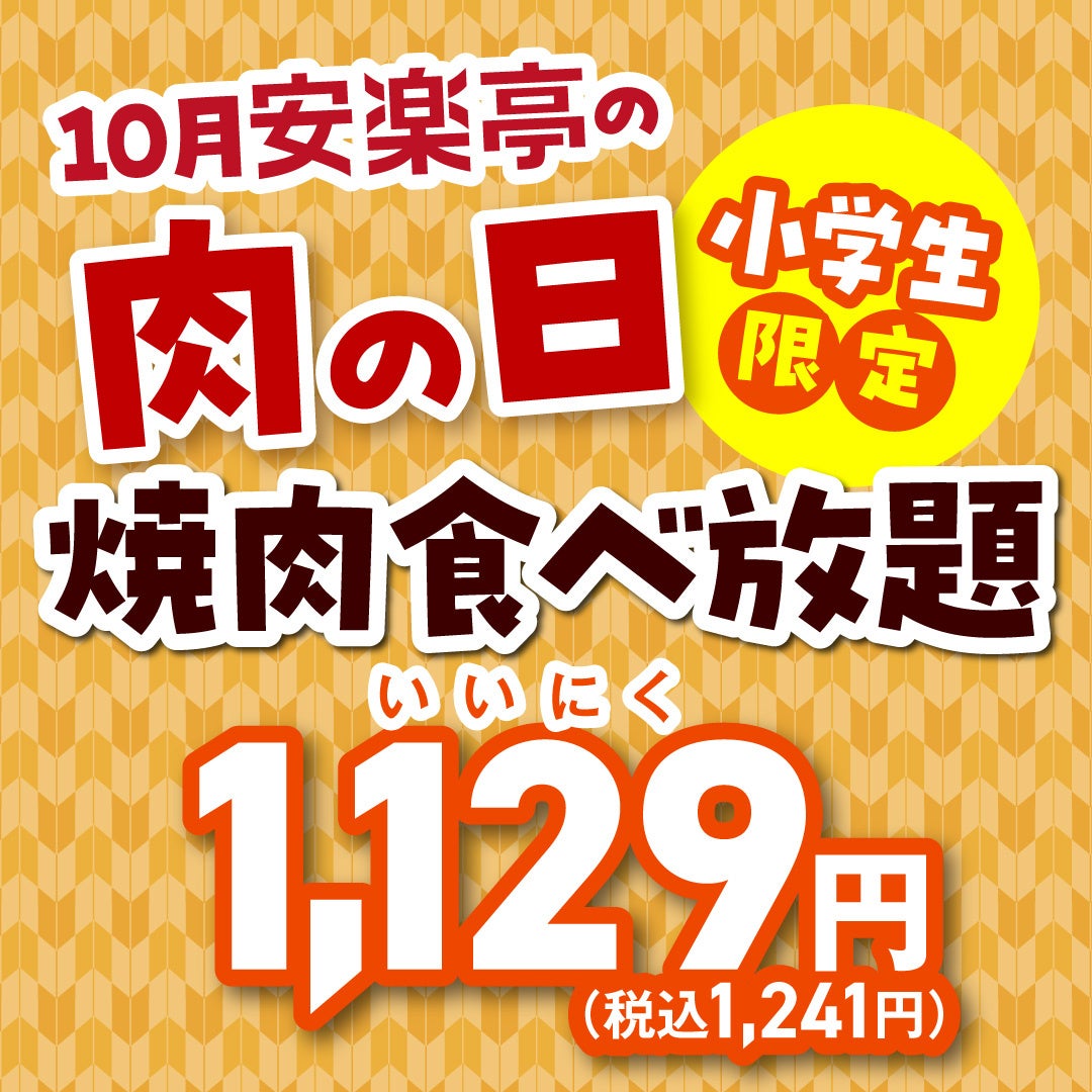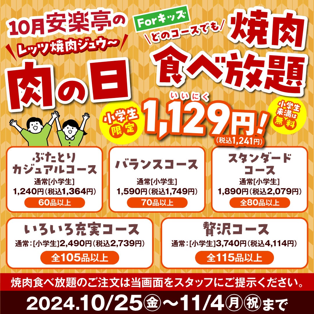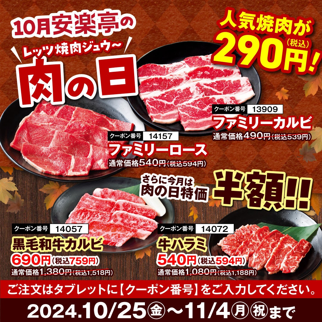 安楽亭(本社:埼玉県さいたま市、代表取締役:柳 先)は2024年10/25(金)~11/4(月)に小学生・焼肉食べ放題1,129円(税別)、焼肉290円(税込)・半額で提供する安楽亭の肉の日を開催。