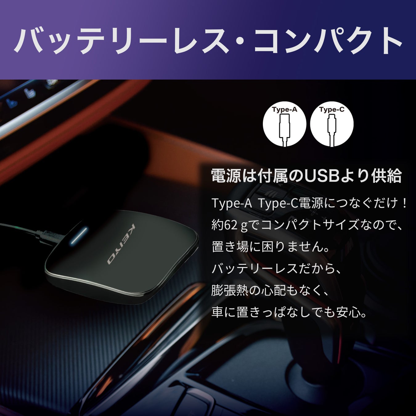 電源は車両のUSB(Type-Aまたは、Type-C)より供給、重量は約70gでコンパクトサイズなので、置き場所に困りません