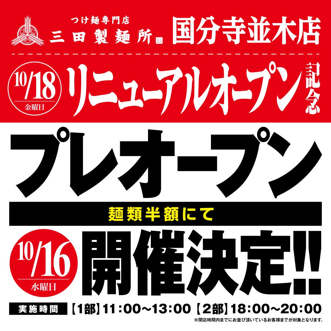 【三田製麺所】10月18日(金)に国分寺並木店がリニューアルオープン!