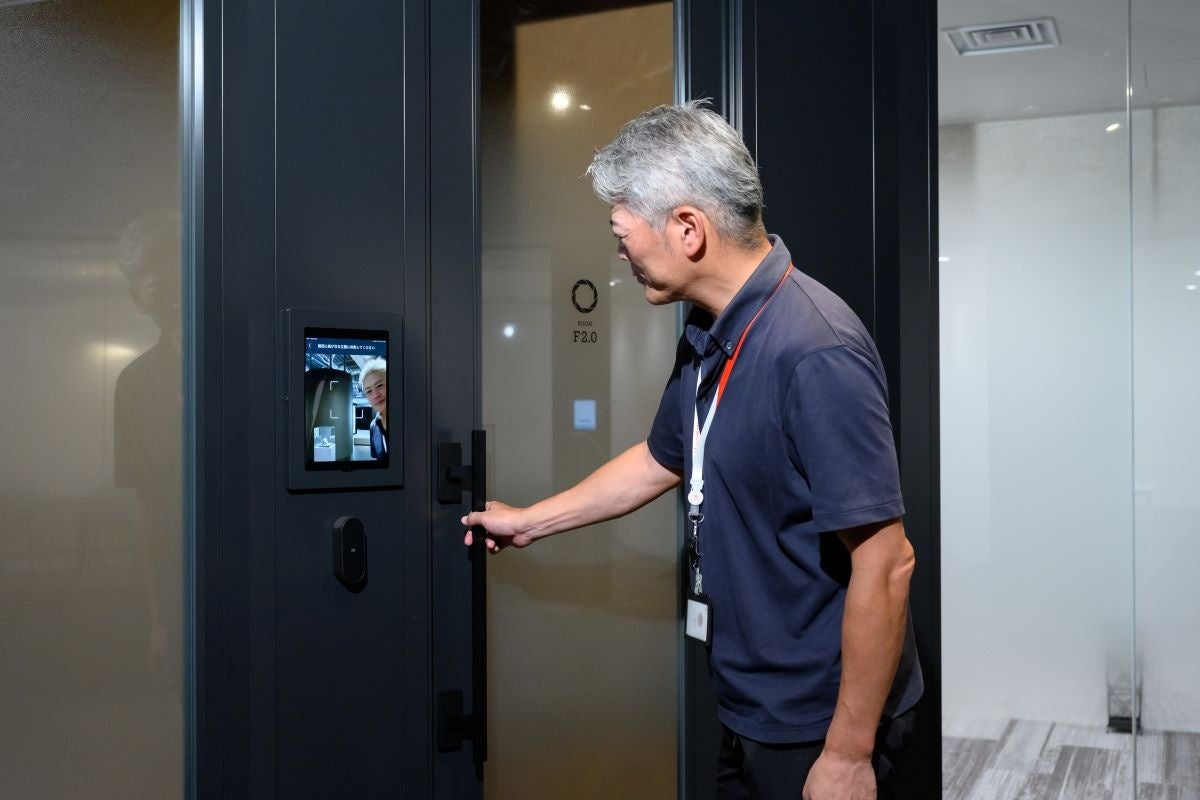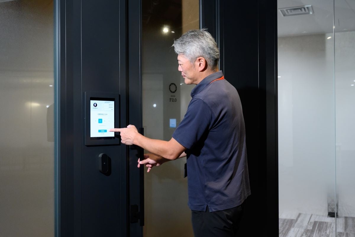 新オフィスは、フロアの入り口8箇所、会議室11室にスマートロックとタブレット端末を設置し、オフィス内をスマートアクセス化。顔をかざすだけで、執務室や会議室に入室可能となりました。