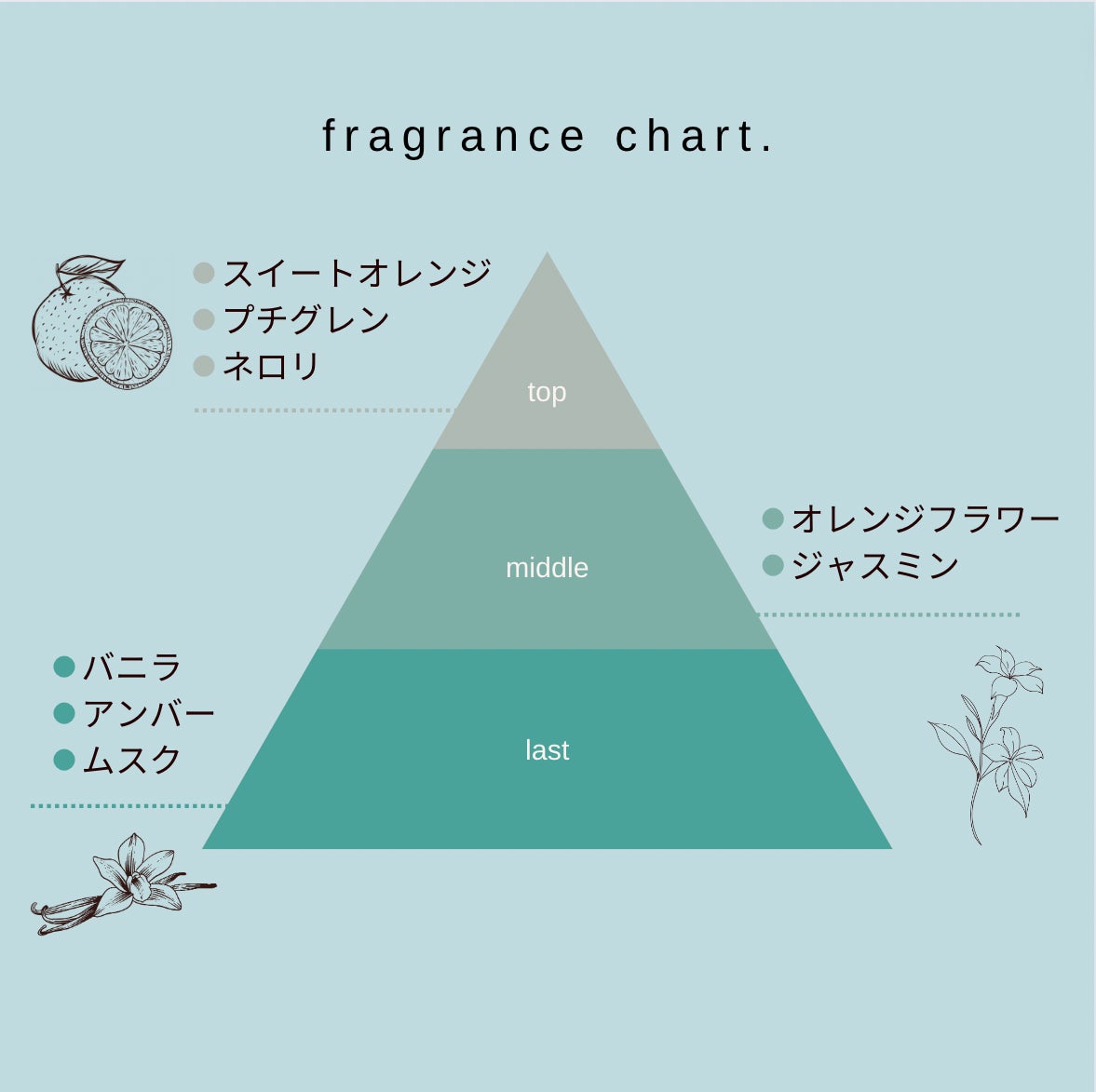 香りのトップは、明るく爽やかなスイートオレンジとネロリの心落ち着く上品な甘さ