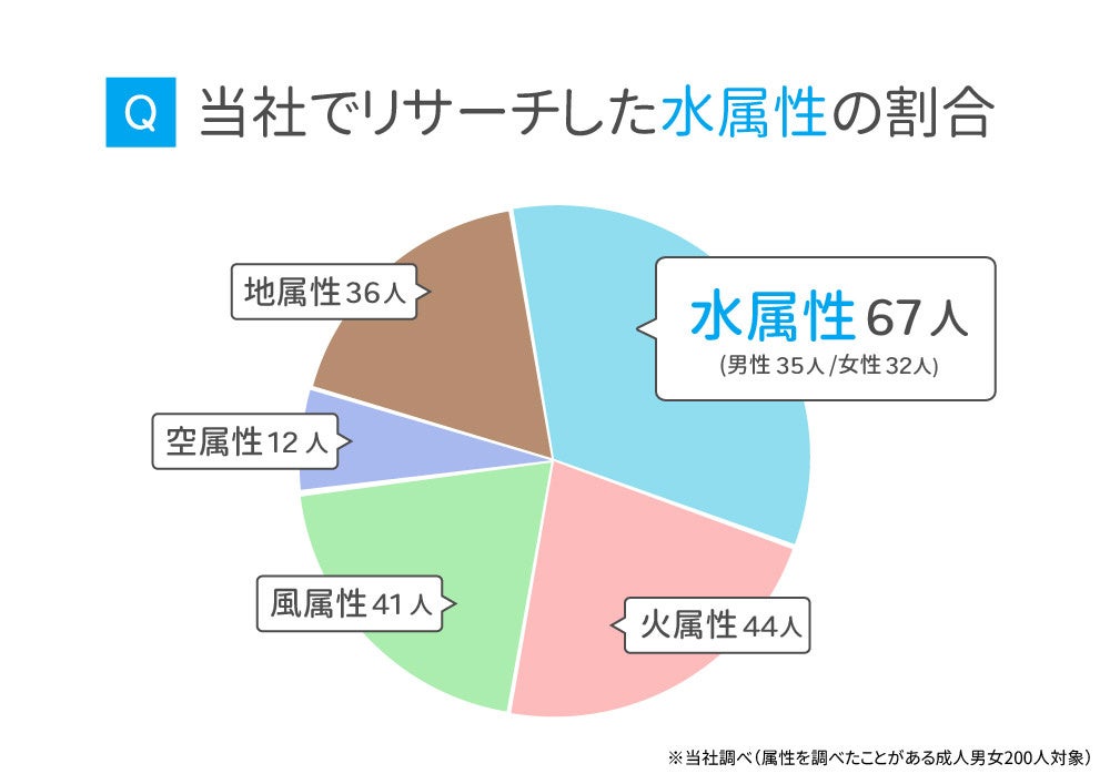 「あなたの属性はなんですか?」と成人男女200人にアンケートをとったところ水属性が67人と最多で、その割合は約34%でした。