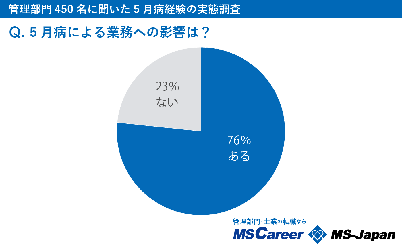 一方、5月病と業務の関係について聞いた設問では、76%が「5月病による業務への影響を感じる」ということがわかりました。