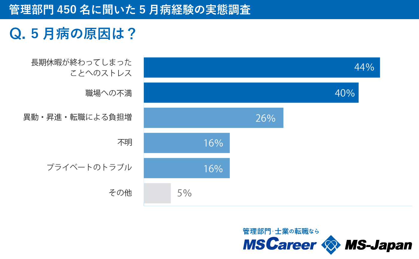 さらに、5月病の原因について聞いた設問では、「長期休暇が終わってしまったことへのストレス」を挙げた方が最も多く44%にのぼった一方で、「職場への不満」も40%と僅差で続く結果となりました。