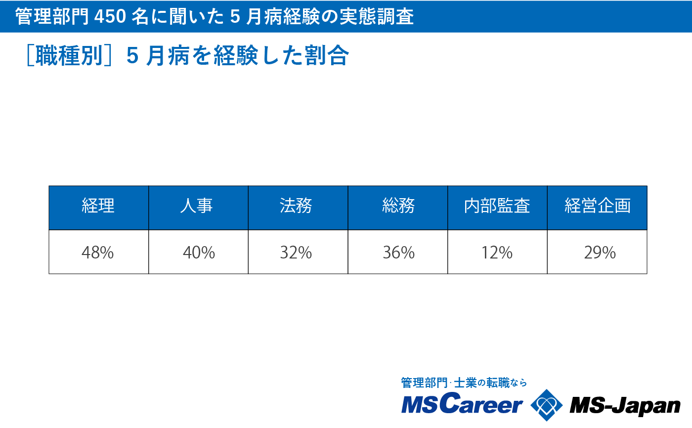 また同設問の回答を職種ごとにみた結果では、5月病を経験した割合が最も高かった職種は経理で48%、一方最も低い職種が内部監査で12%でした。