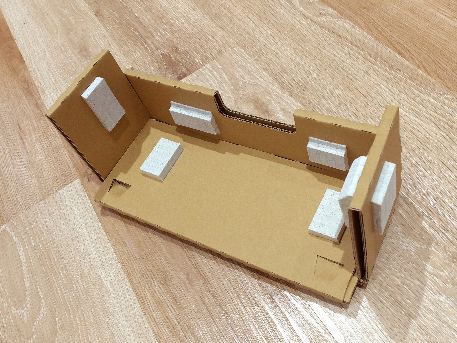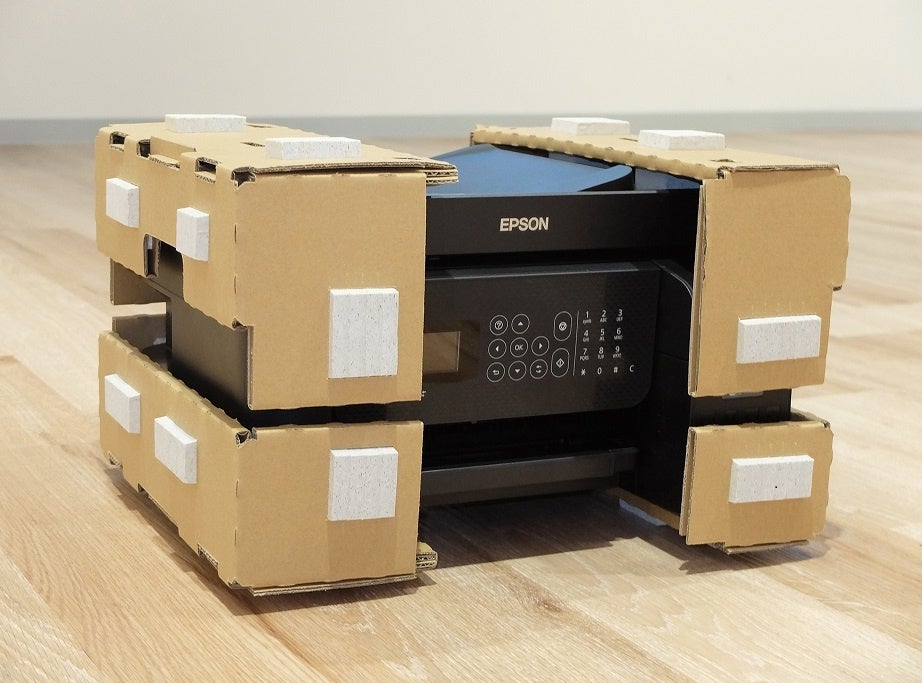 性能的にも、高性能な石油由来の緩衝材と同等以上の衝撃吸収性を持ち、緩衝距離を変える必要が無く、個装箱のサイズを変えずに済むことから資源の有効活用ができ、現在、プリンターの緩衝材に使用しています。また、組み立て式のため廃棄時に減容化でき、全体を紙としてリサイクルすることも可能です。