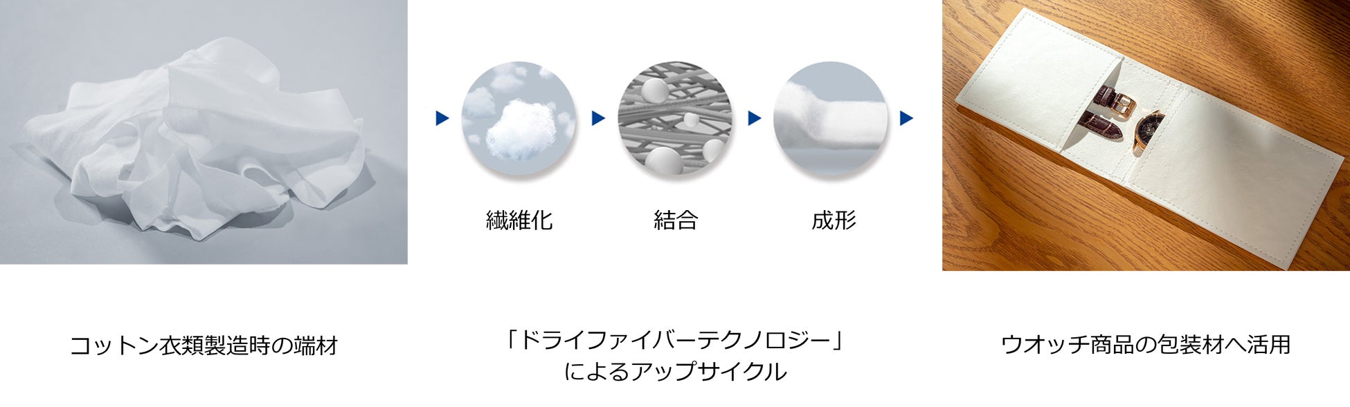 エプソン独自の「ドライファイバーテクノロジー」を応用し、コットン衣類の縫製過程で発生する端材を原料としてアップサイクルした新たな包装材を実用化しました。この包装材はエプソンが販売する一部のウオッチ商品に採用されています。コンパクトなデザインかつ、コットンの純白色を生かし清楚感を演出したことにより、ユーザー様が購入後も捨てずに腕時計の保管、財布や小物入れとしてご活用いただけます。また、素材はコットンが主原料で、これまでに無いような好触感で、折り曲げ、引っ張りに強く、高温高湿下でも機能を損なわない仕様になっています。